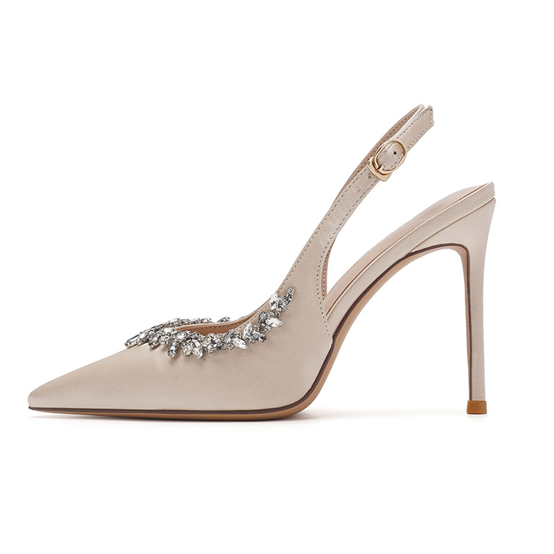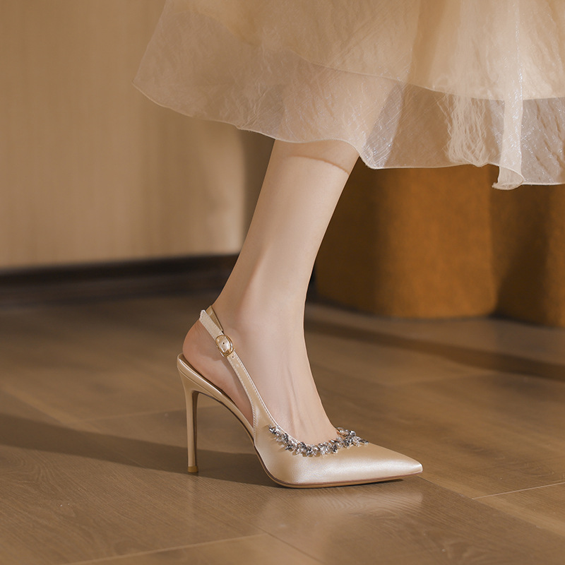 Женские летние туфли-лодочки на высоком каблуке-шпильке с французским стилем, стразами, заостренным носком, накладкой на носке и открытой пяткой.