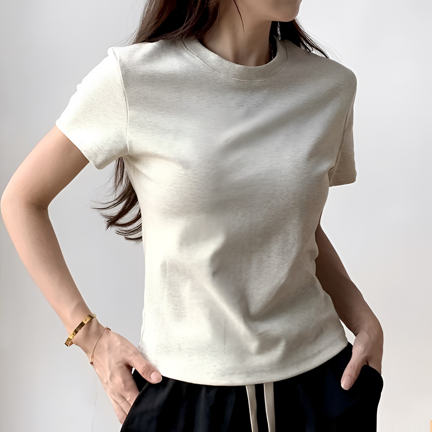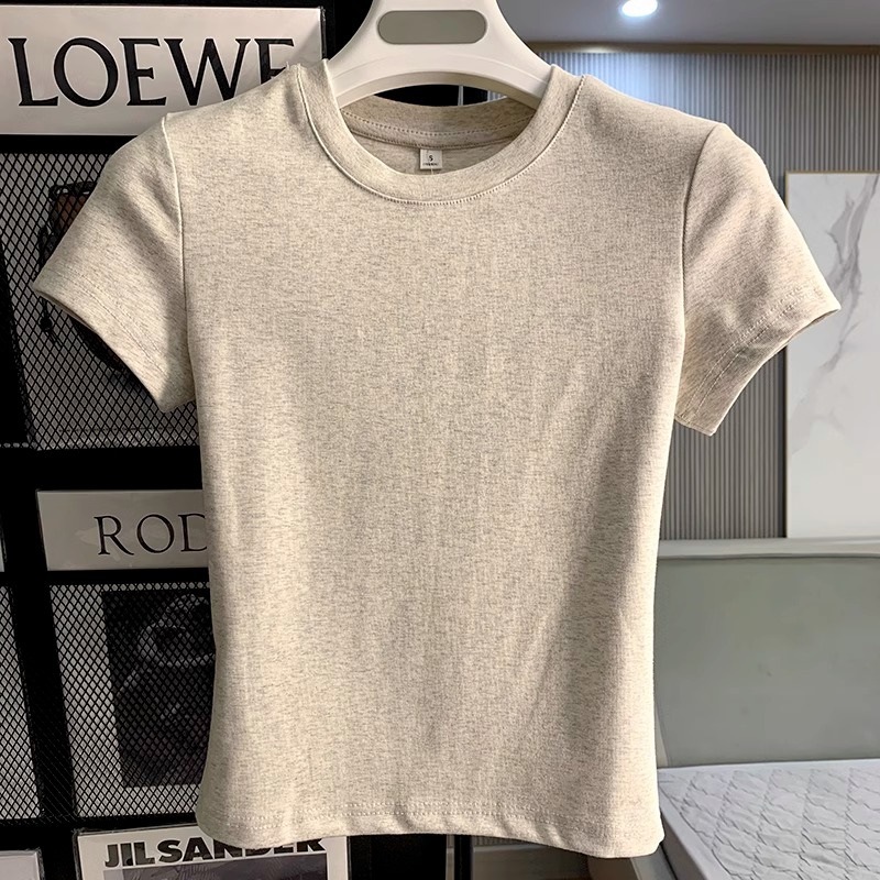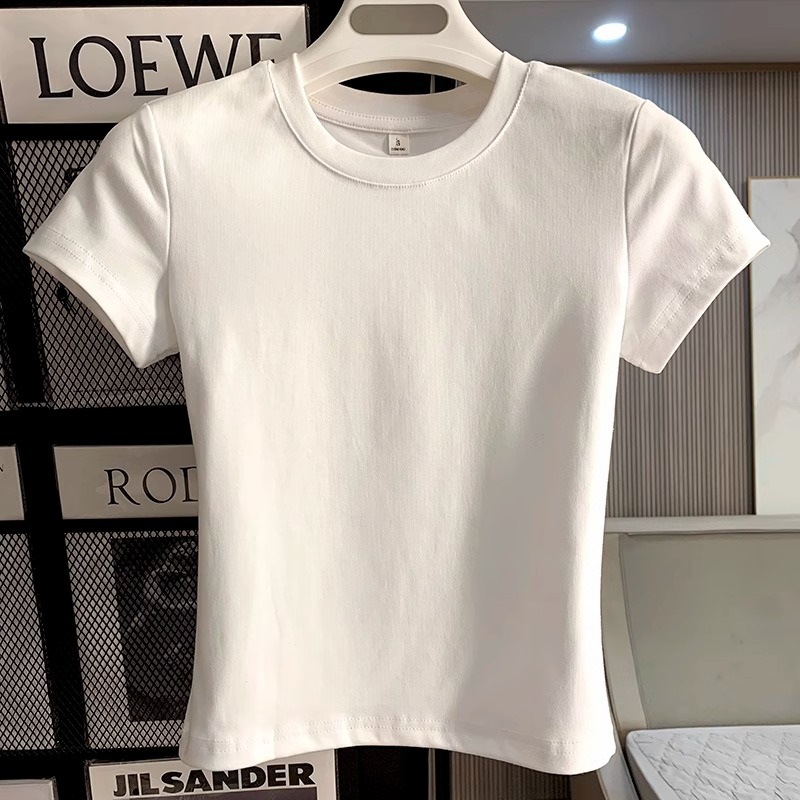 Главная страница > Элегантная универсальная футболка с круглым вырезом и обычными плечами, женская футболка с короткими рукавами, лето 2025, новая повседневная модная базовая рубашка, короткий топ