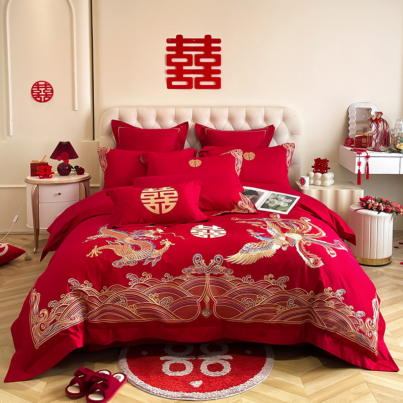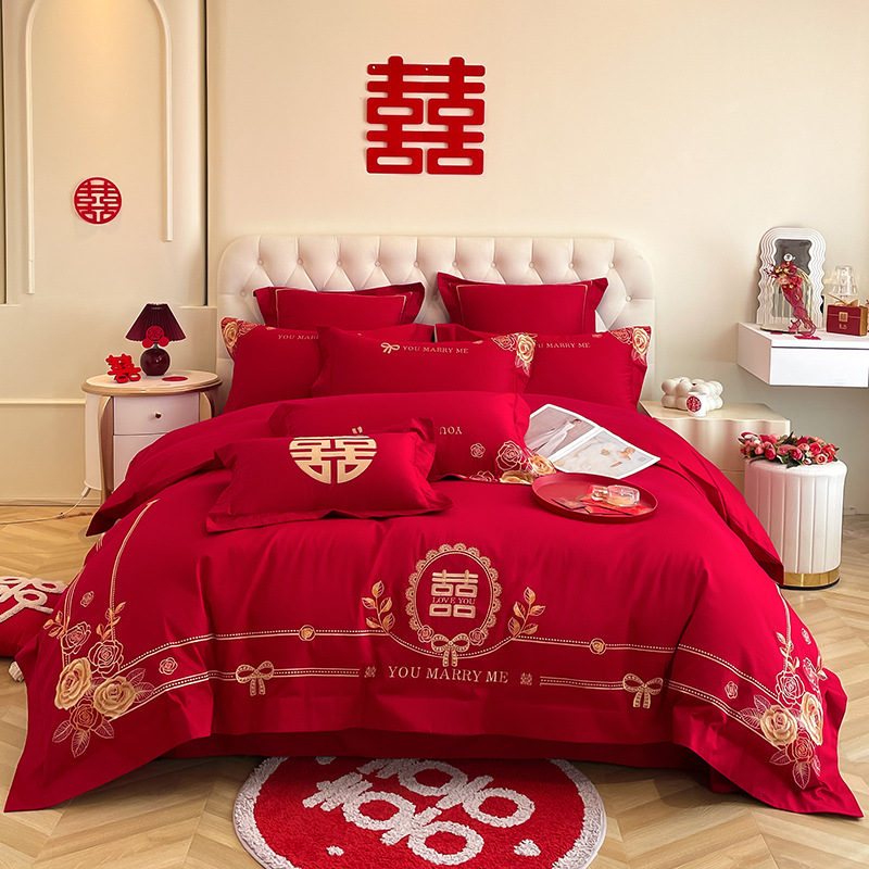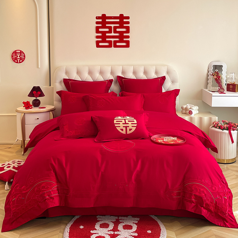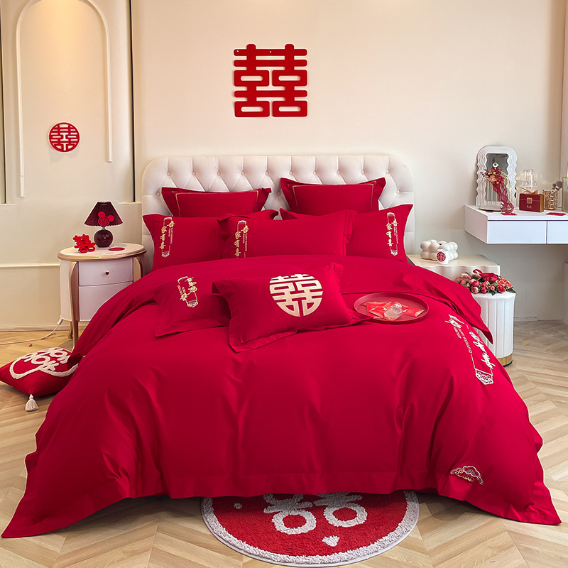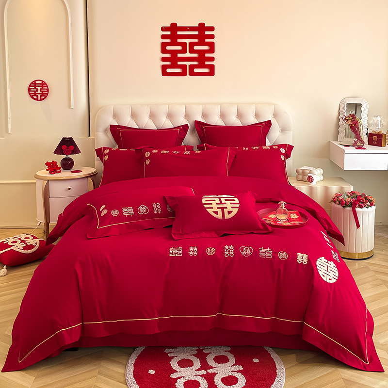 Главная страница > Новое высококачественное свадебное красное Хлопковое одеяло из четырех частей в китайском стиле, двойное счастье, простыня, свадебное одеяло для нового дома, из трех частей, новый дом