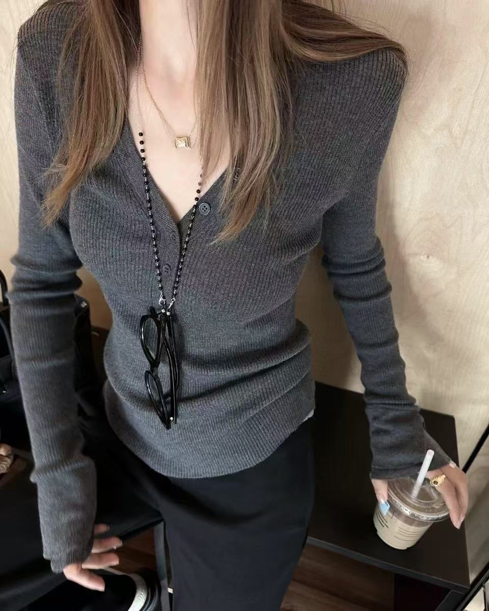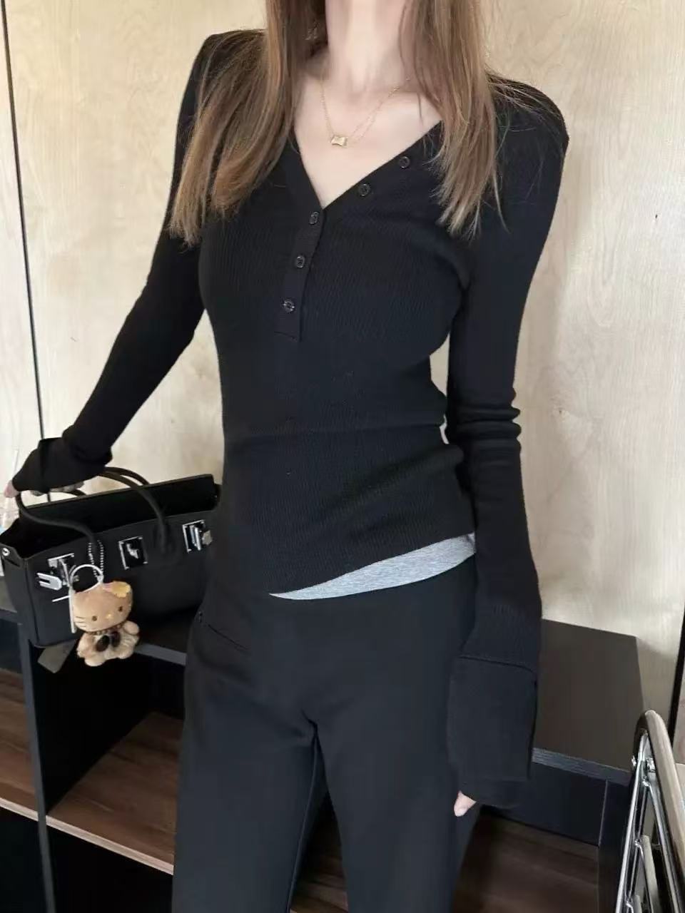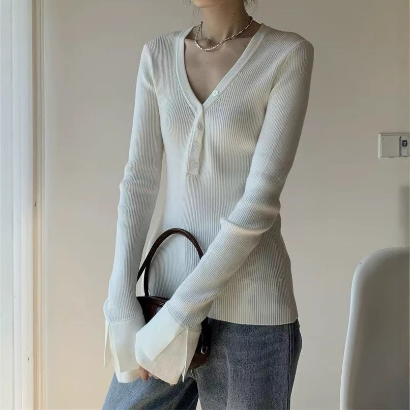 Главная страница > Женский трикотажный свитер с V-образным вырезом и завышенной талией в корейском стиле, осенний облегающий базовый топ, утягивающий внутренний слой, в стиле Ins.