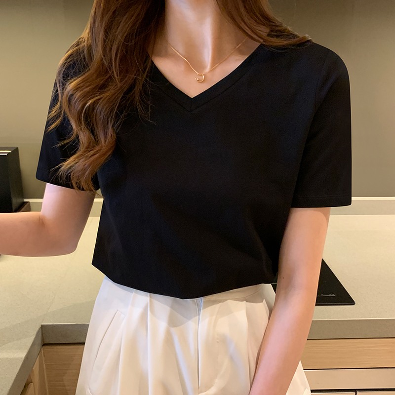 Главная страница > Футболка с v-образным вырезом, женская рубашка с короткими рукавами и белым низом, новинка 2025 года, хлопковый летний топ с короткими рукавами и воротником в форме сердца на правое плечо