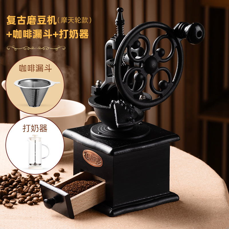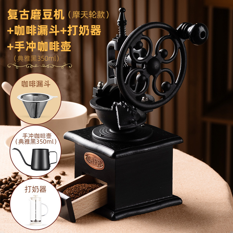 ☆★Ретро кофемолка [модель колеса обозрения] + кофейная воронка + кофейник ручной работы (элегантный черный 350 мл) + вспениватель молока☆★