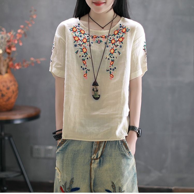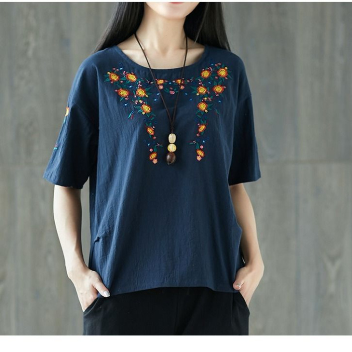 Главная страница > Трансграничная вышивка с круглым вырезом этническая рубашка женская рубашка с короткими рукавами летняя новая свободная футболка большого размера ретро литературная футболка женская топ