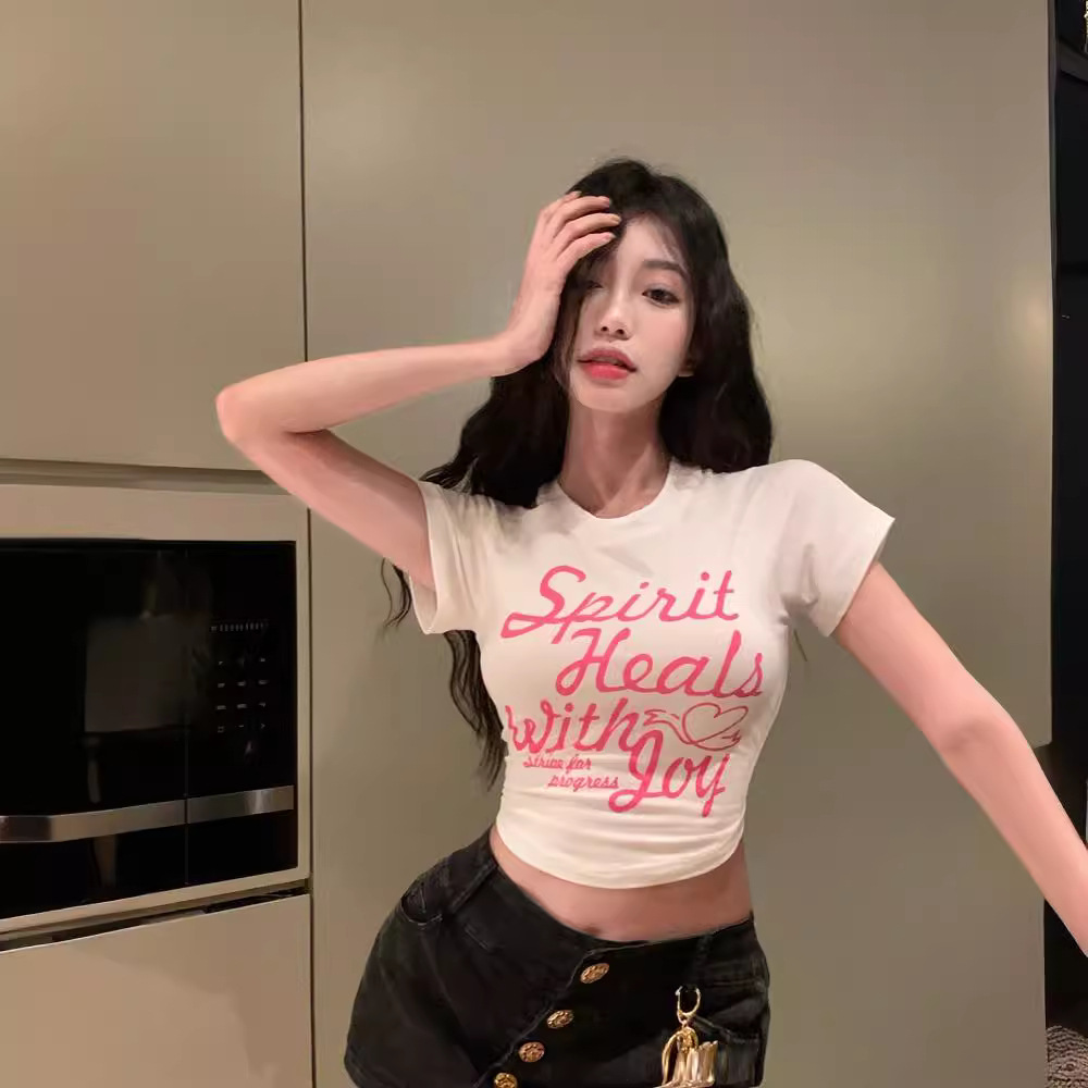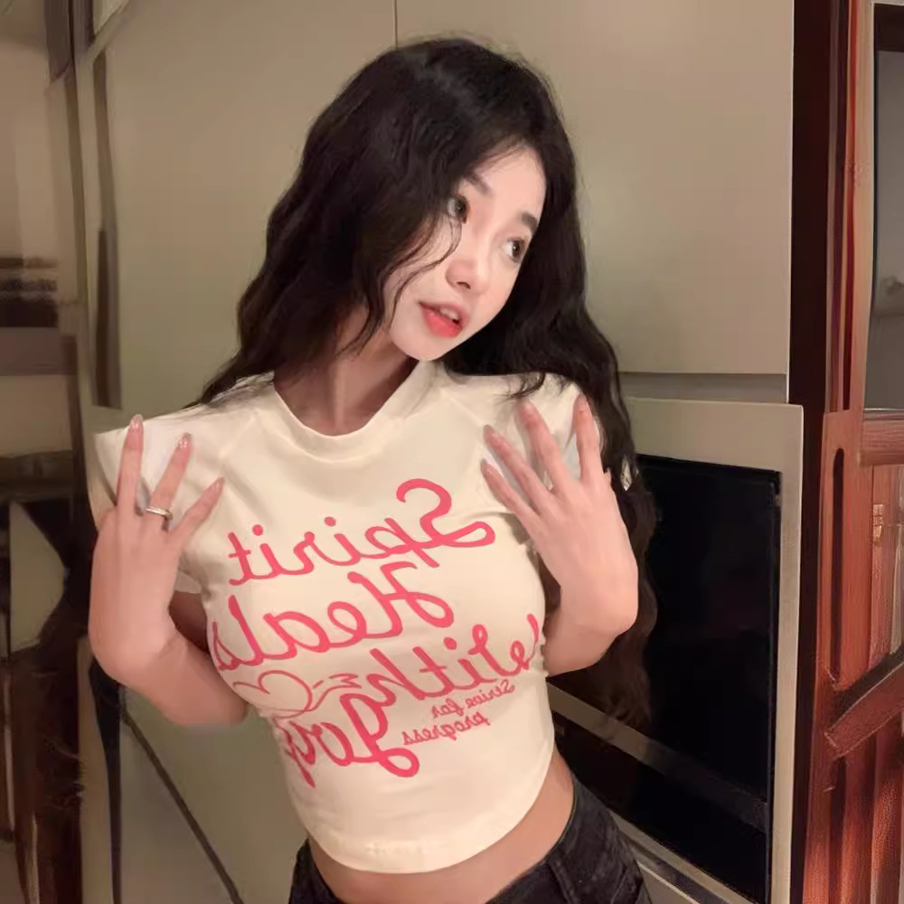 Главная страница > Милая и острая Футболка с принтом Модная летняя белая облегающая Сексуальная короткая футболка с короткими рукавами для девочек с высокой талией и пряностями Женский топ с короткими рукавами Модный