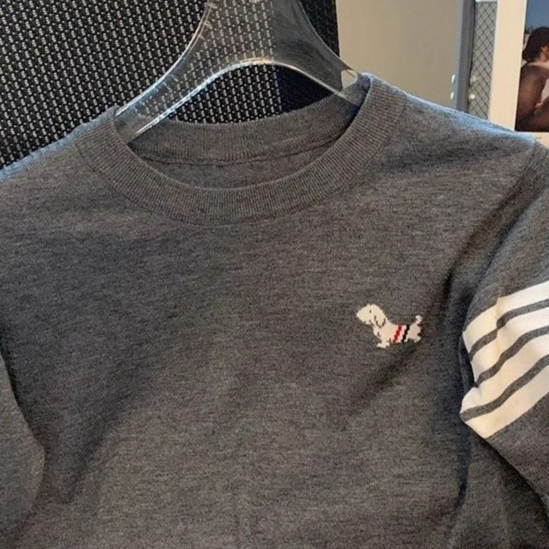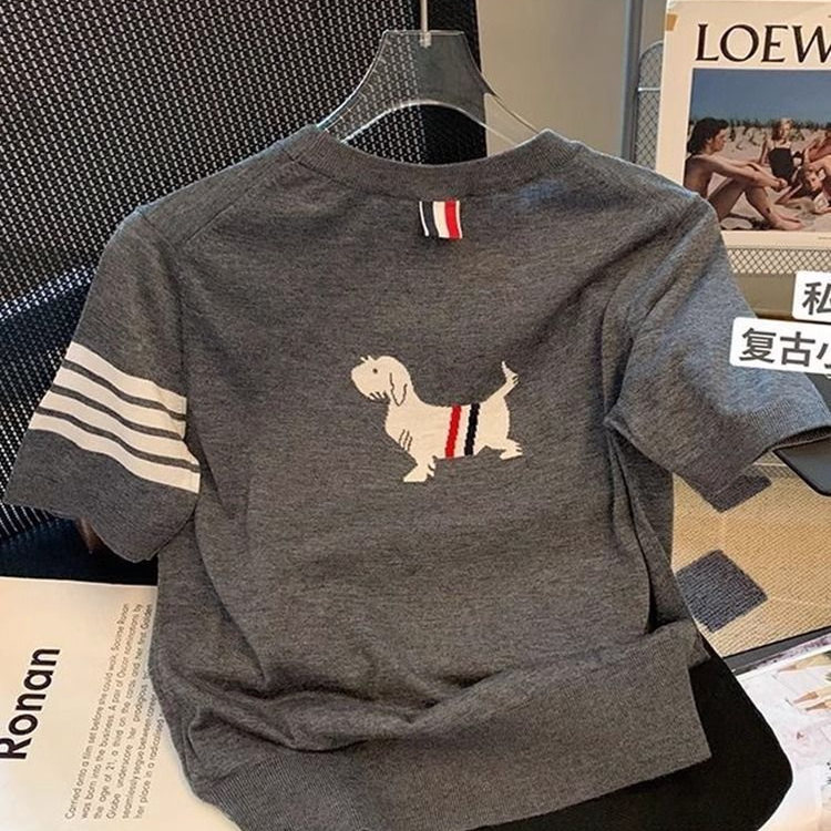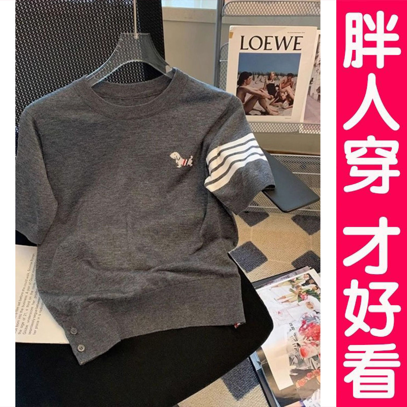 Главная страница > Летний тонкий свитер из ледяного шелка, женская футболка с короткими рукавами, свободная тонкая тонкая щенок с принтом в полоску, толстый мм топ большого размера