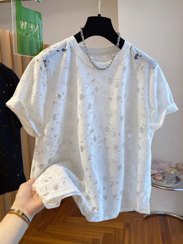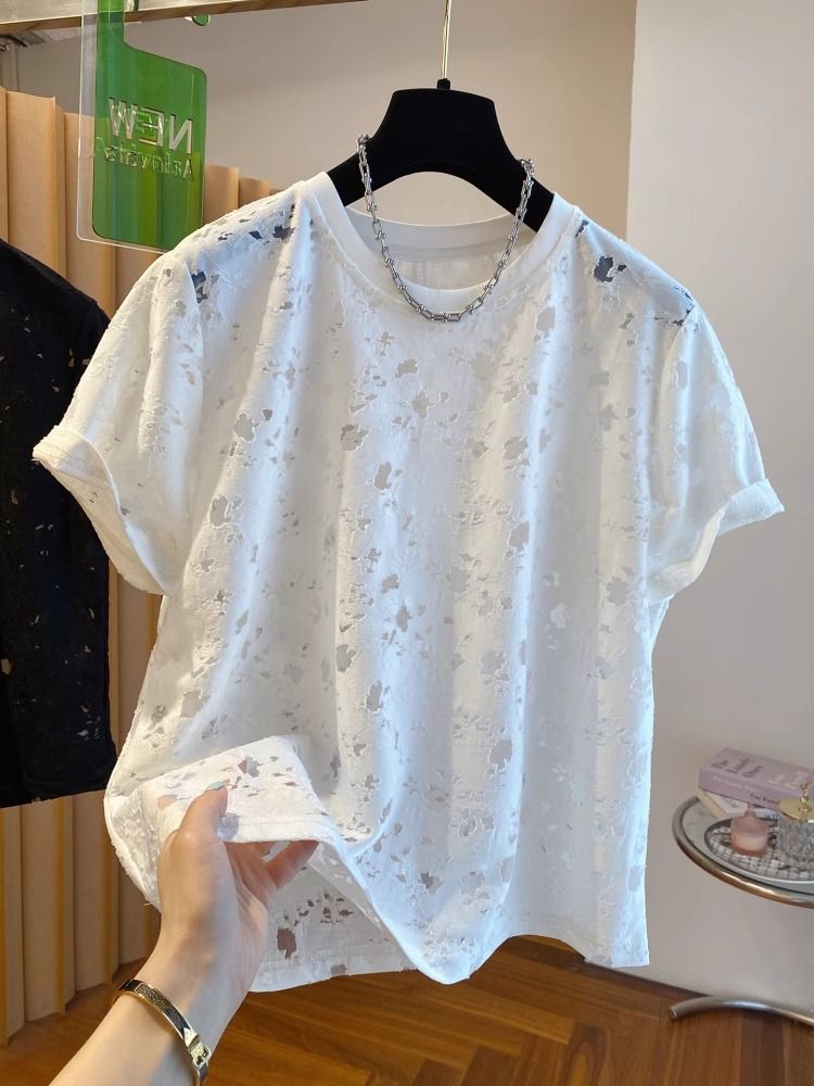 Главная страница > Очень большой размер 120kg года, женская футболка с вырезами в корейском стиле, с короткими рукавами, европейский дизайн, свободный и красивый, очень хороший летний топ