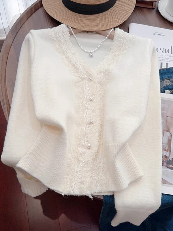 Главная страница > Весна и Осень 2024 Новый французский кружевной шитье с v-образным вырезом с длинными рукавами трикотажный кардиган для женщин высокого уровня темпераментный свитер топ