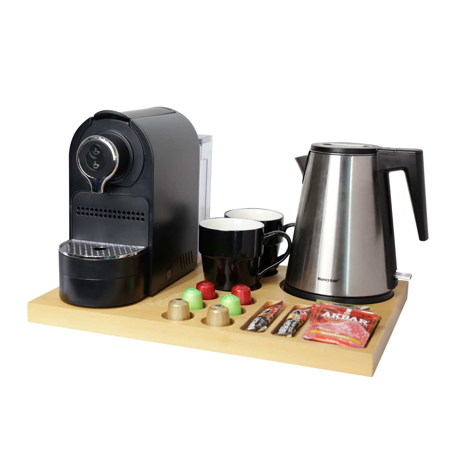 Черная кофемашина + деревянный поднос + чайник H1205 + чашка