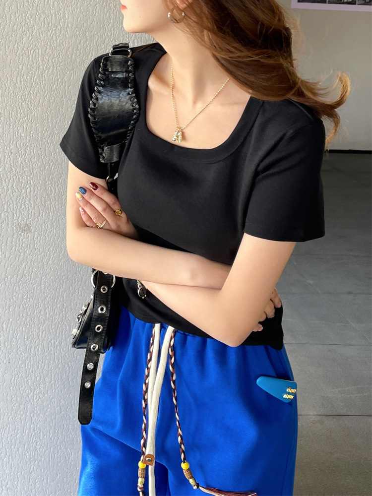 Главная страница > Базовая белая футболка из хлопчатобумажной ткани с коротким рукавом, женская, летняя новинка 2025 года, круглый вырез, приталенная, простая, на правое плечо