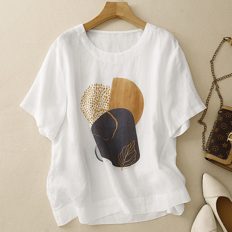 Главная страница > Футболка из хлопка и льна с настоящим принтом с короткими рукавами свободная и тонкая летняя одежда новый ретро повседневный темперамент элегантный хватер топ
