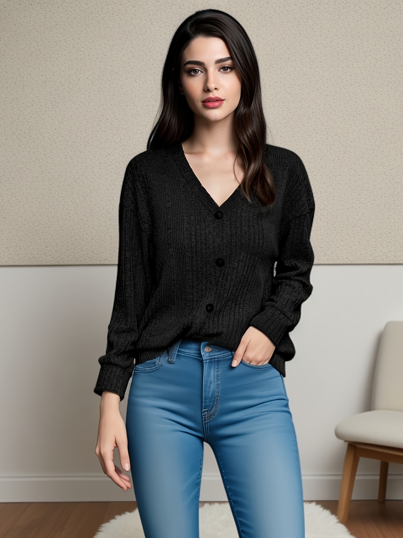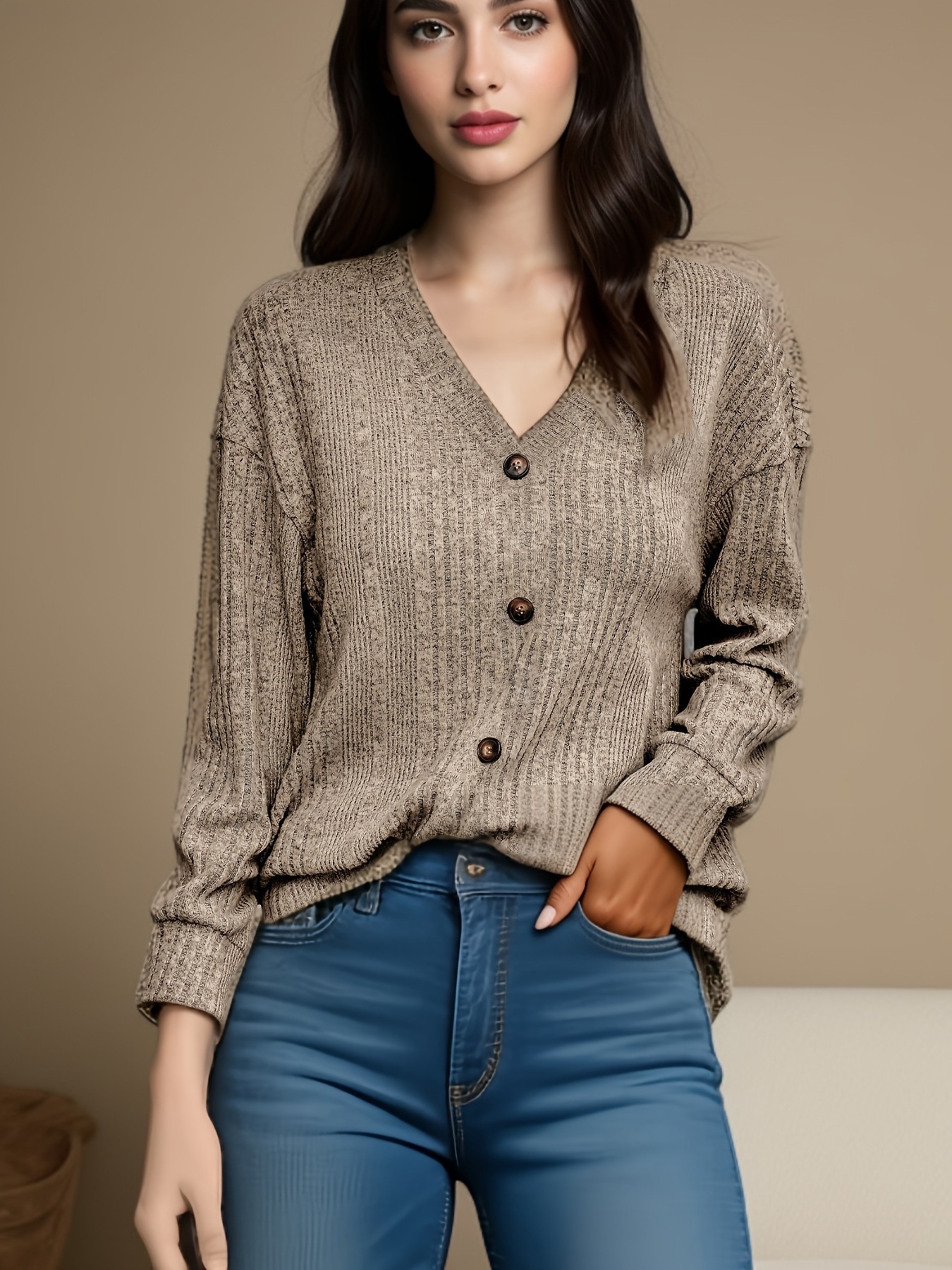 Главная страница > Новинка осени/зимы 2025: Женский вязаный свитер на пуговицах в европейском и американском стиле, повседневный свободный топ с длинным рукавом, женская футболка
