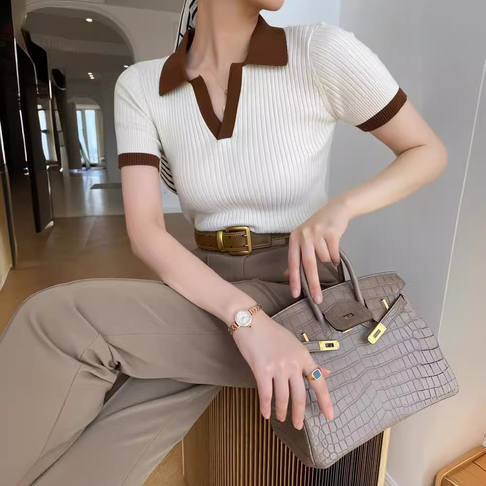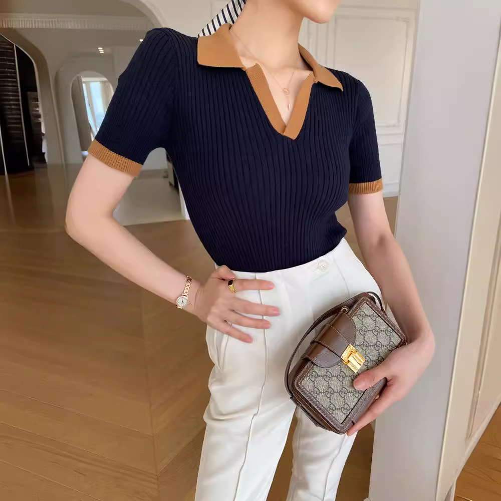 Элегантная французская рубашка-поло высокого класса, женский летний контрастный топ из ледяного шелка с V-образным вырезом и короткими рукавами, приталенный вязаный свитер с внутренней стороны