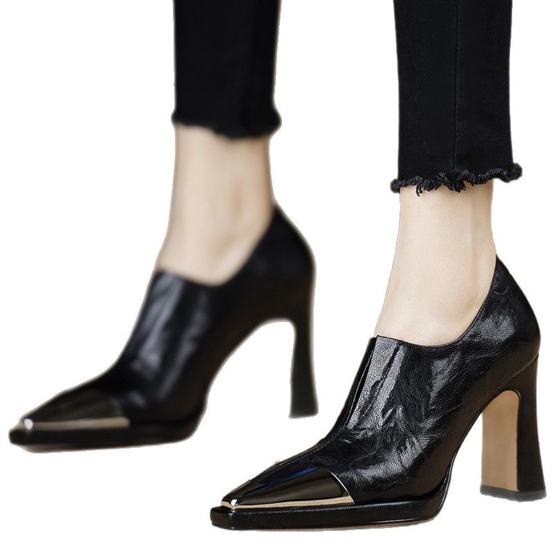 Британские ветры противоударные металлические головы черные кожаные туфли женские 2024 новые туфли с глубоким ртом туфли на высоком каблуке