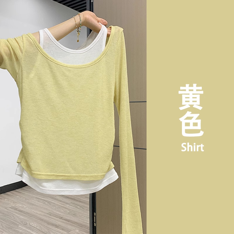Желтый поддельный двухкомпонентный солнцезащитный крем тонкий трикотажный блузка с длинными рукавами женский 2025 новый летний допаминовый чистый ветер топ