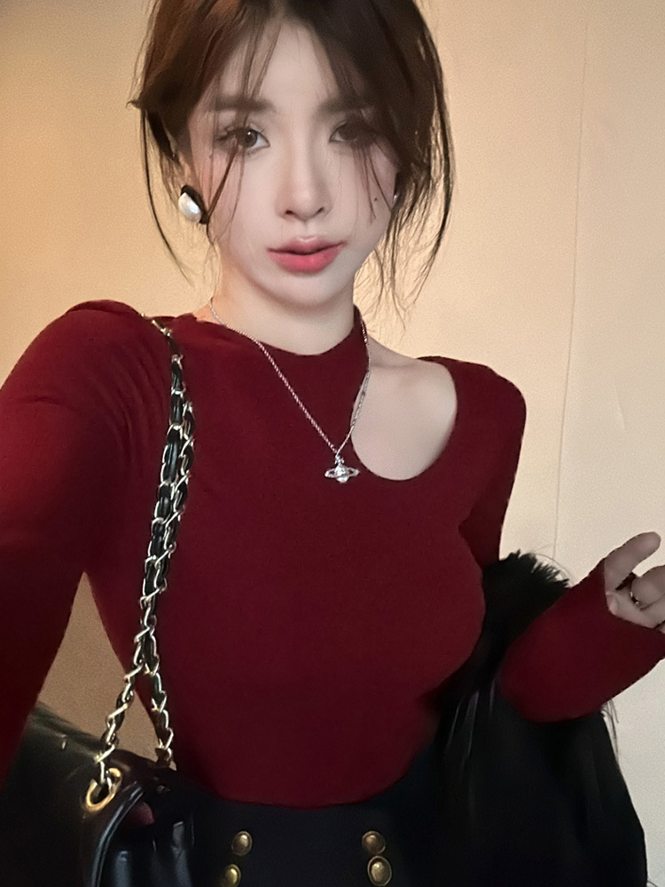Delong Pure Spice Girl Feng Xiaoscinchi с полой нижней рубашкой футболка женская осень-зима с открытыми плечами с длинными рукавами тонкий топ