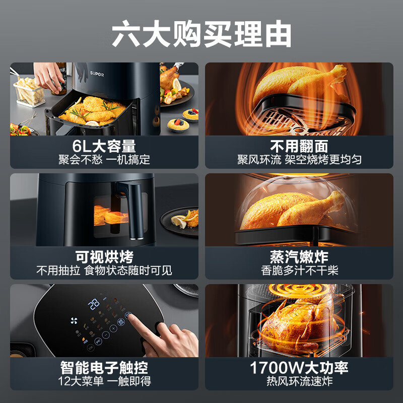 Мультифункциональная аэрофритюрница Supor 6 л с сенсорным управлением, функцией приготовления на пару и интеллектуальным управлением, модель KD60D830A