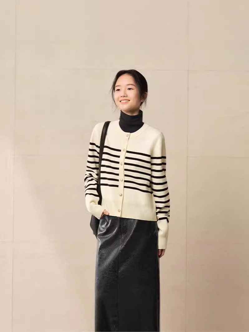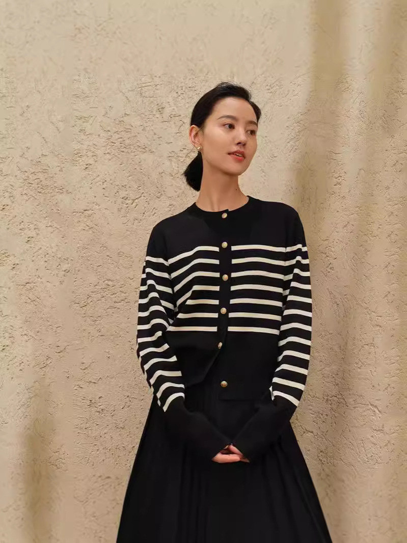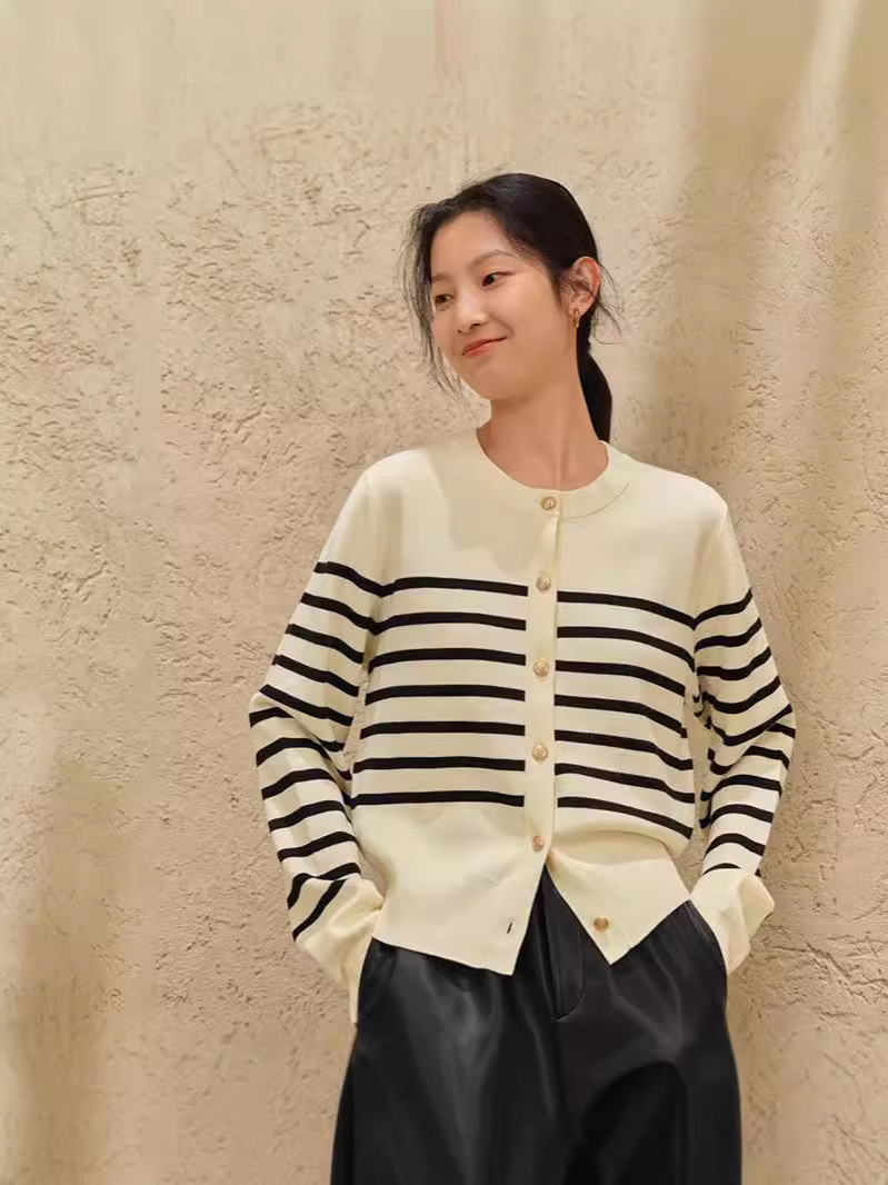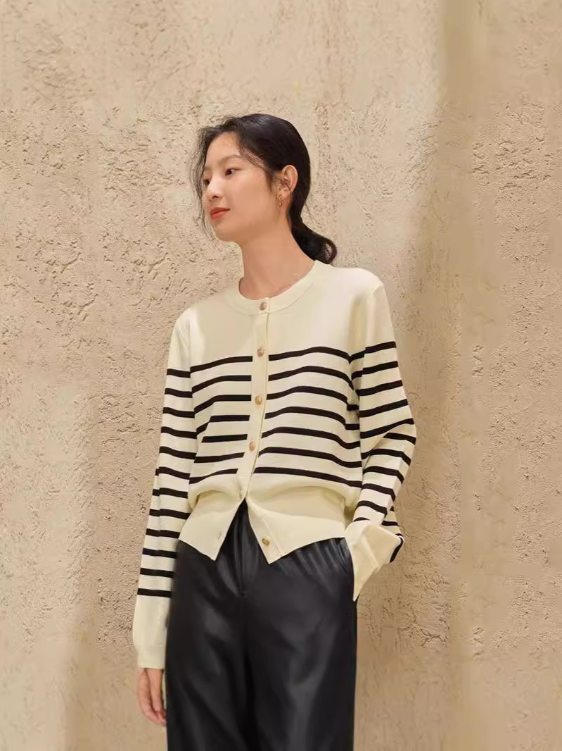 Главная страница > Женский вязаный кардиган с контрастной полоской, весна 2025, новый повседневный ретро-кардиган с круглым вырезом, идеально подходит для любого образа
