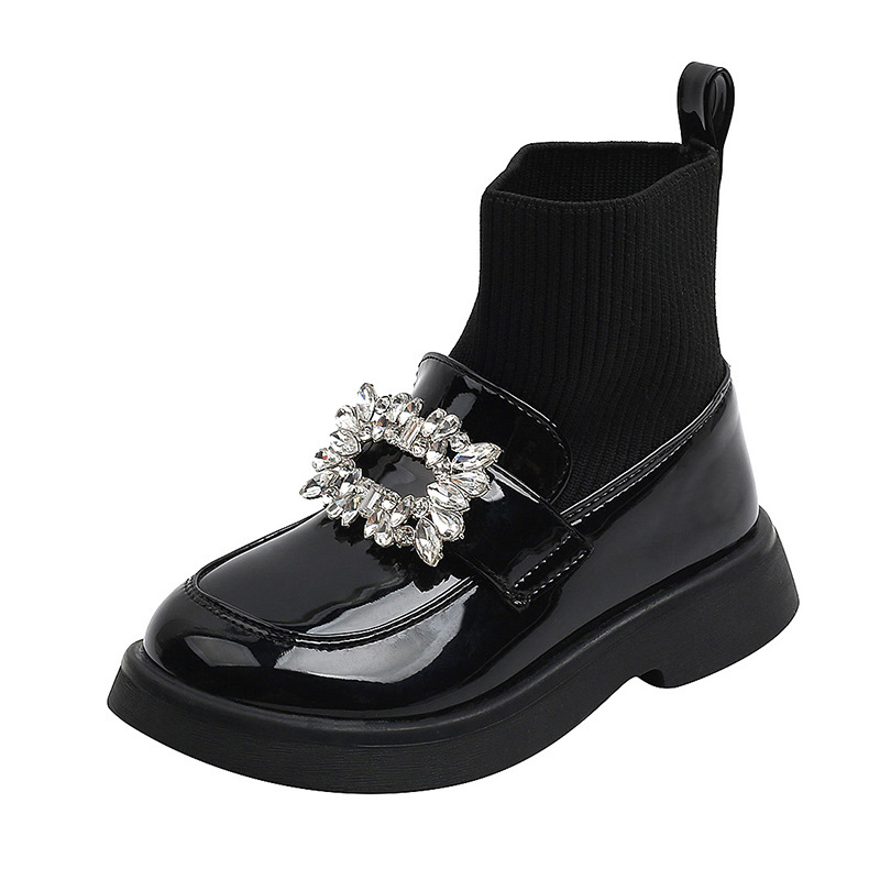 Сапоги для девочек 2024 новые летающие плетеные сапоги весной и осенью детские туфли из чужого газа страз маленькие кожаные ботинки черные сапоги