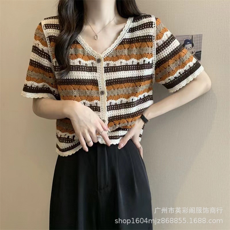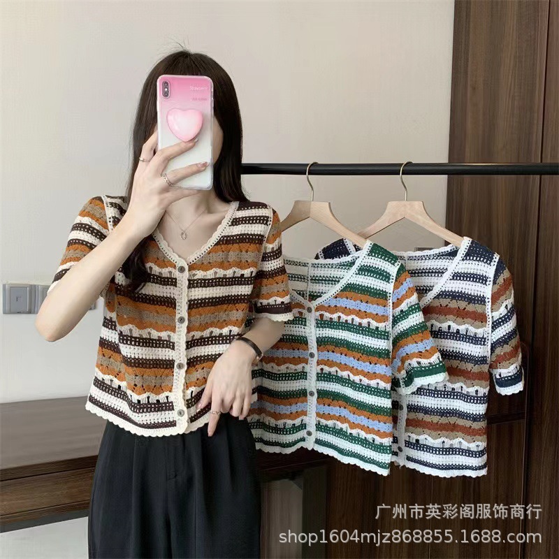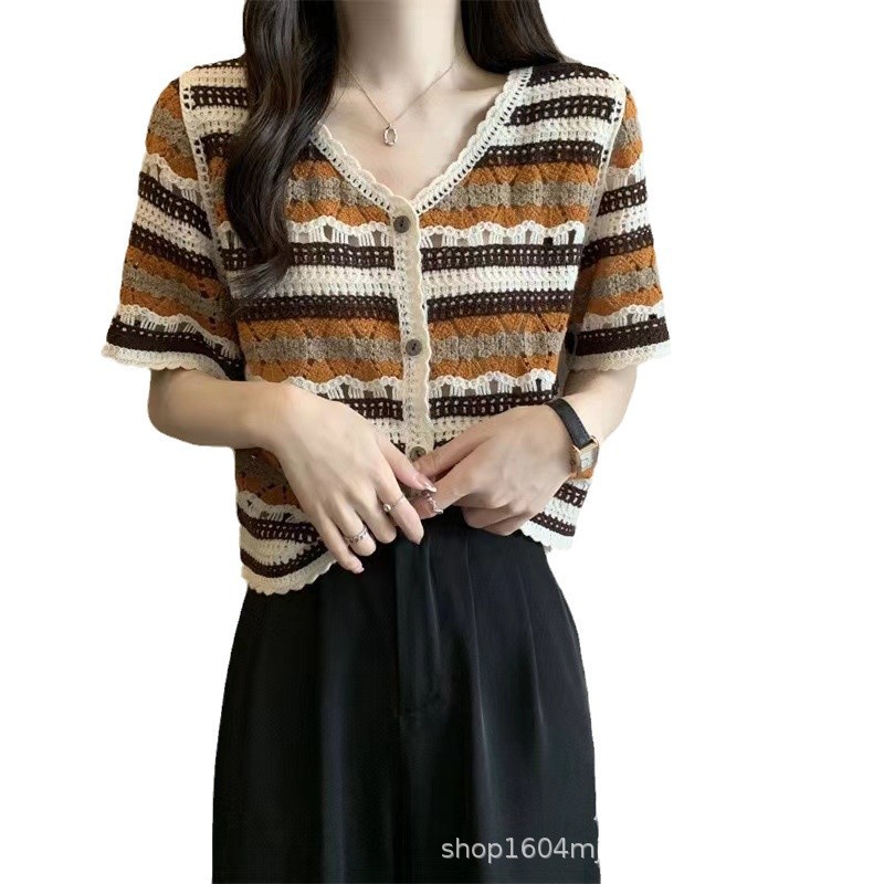 Главная страница > Французский продвинутый сенсорный вязаный кардиган с V-образным вырезом в полоску