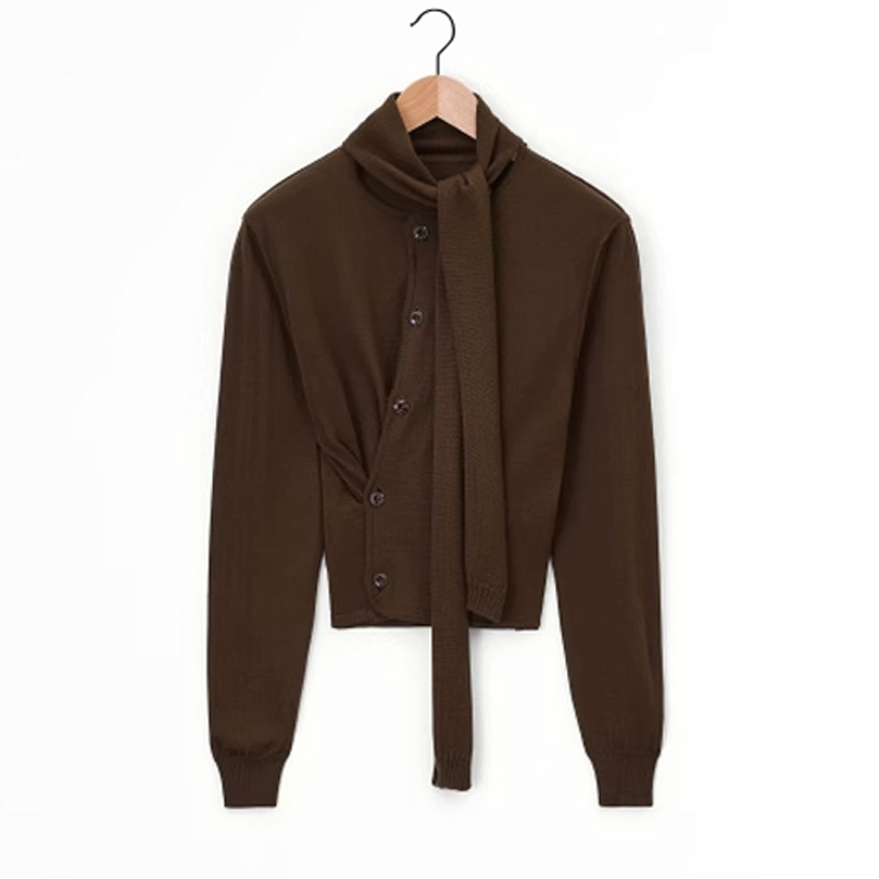 Главная страница > Европейский и американский женский фундук коричневый шнуровка шарф с вращением плиссированный кардиган сплошной цвет сшитый длинный рукав новый кардиган куртка