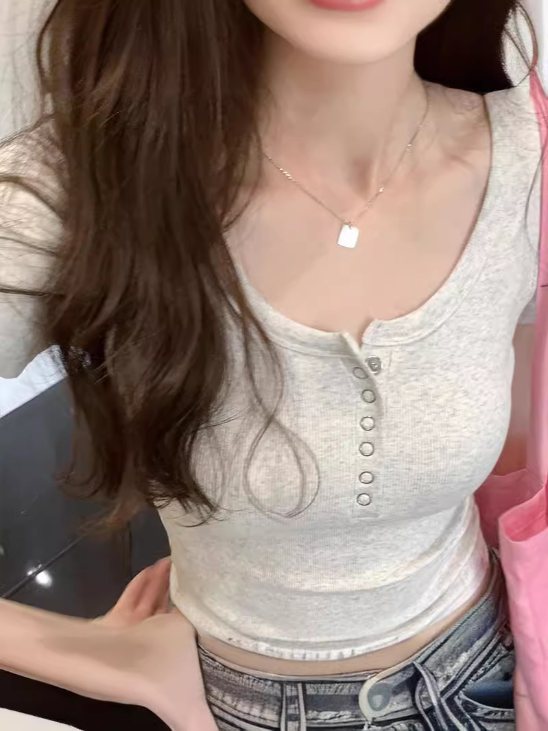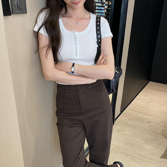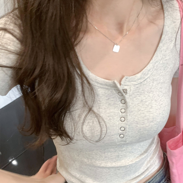 Главная страница > Футболка из резаного хлопка на пуговицах Женская короткая рубашка с короткими рукавами 2024 летом новый квадратный воротник дикий внешний вид тонкий топ