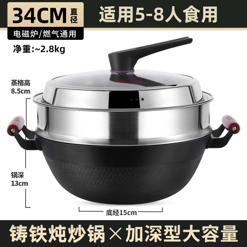 Вок глубиной 34 см [высококачественный чугун] с крышкой и пароваркой
