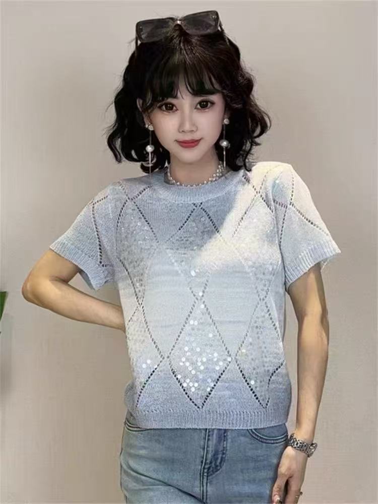 Летний сладкий блеск топ трикотажный футболка с короткими рукавами свободный 2025 новый темпераментный дизайн минус возраст топ