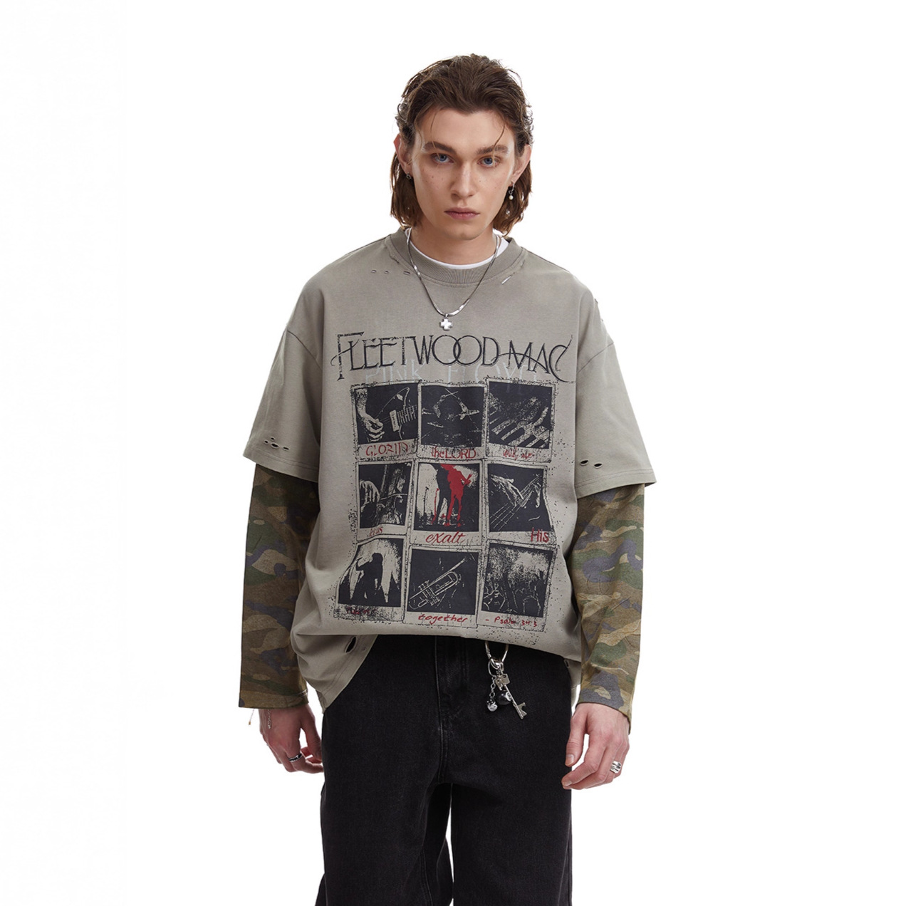 Главная страница > Мужская одежда Jiayiku, осень 2025, новая американская ретро-рок, модная брендовая футболка из двух частей с граффити и камуфляжем, футболка с длинными рукавами