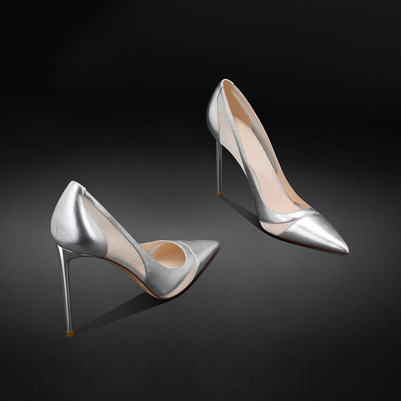 Главная страница > Размер 32-45, 2024, весенний новый стиль, серебряные туфли на высоком каблуке из сращенной сетки, женские элегантные туфли на шпильке с острым носком и неглубоким носком