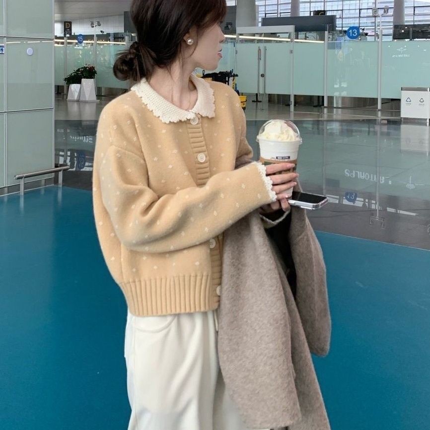 Главная страница > 2024 осенний новый сладкий модный крюк с отворотом свитер с длинными рукавами женский свободный дикий кружевной свитер