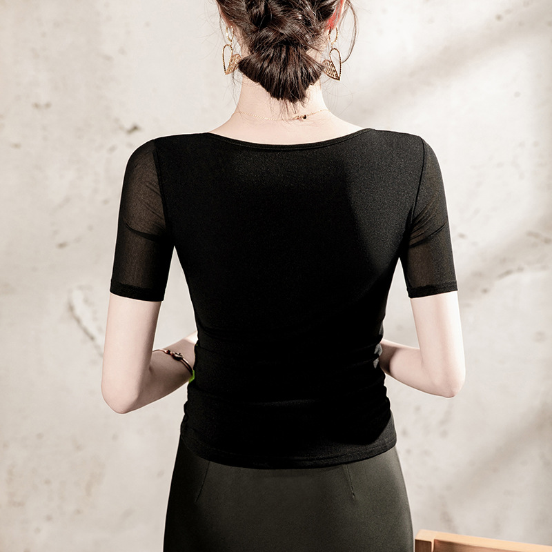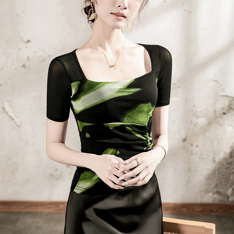 Главная страница > Квадратный воротник с принтом сетчатой пряжи топ с короткими рукавами складки 2025 летняя женская футболка с половинным рукавом