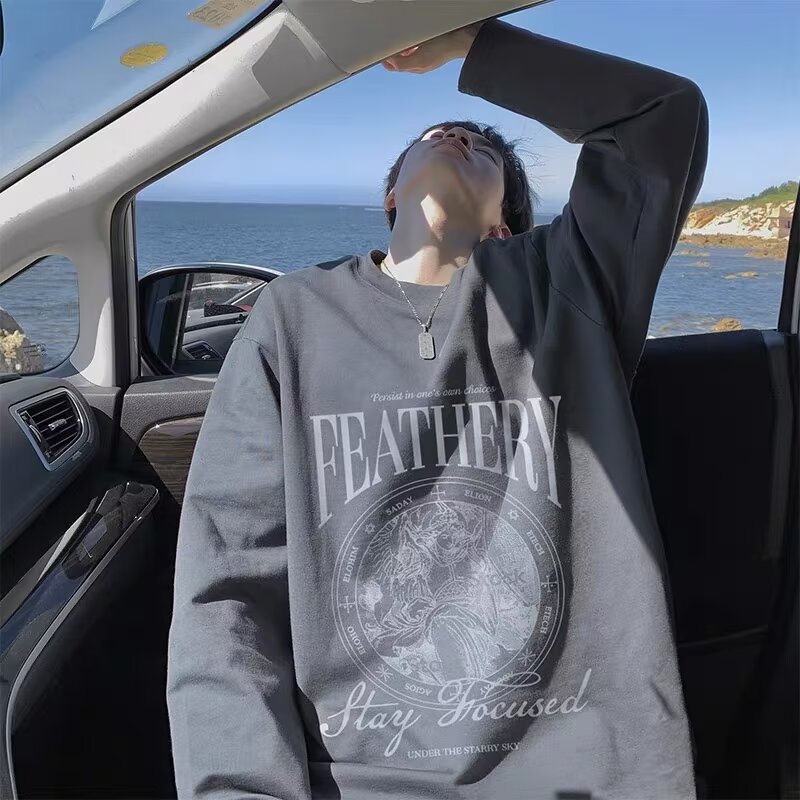 Тяжелый хлопок футболка с длинными рукавами мужская 2024 новая высокая улица приливная печать бренда свободная повседневная рубашка большого размера