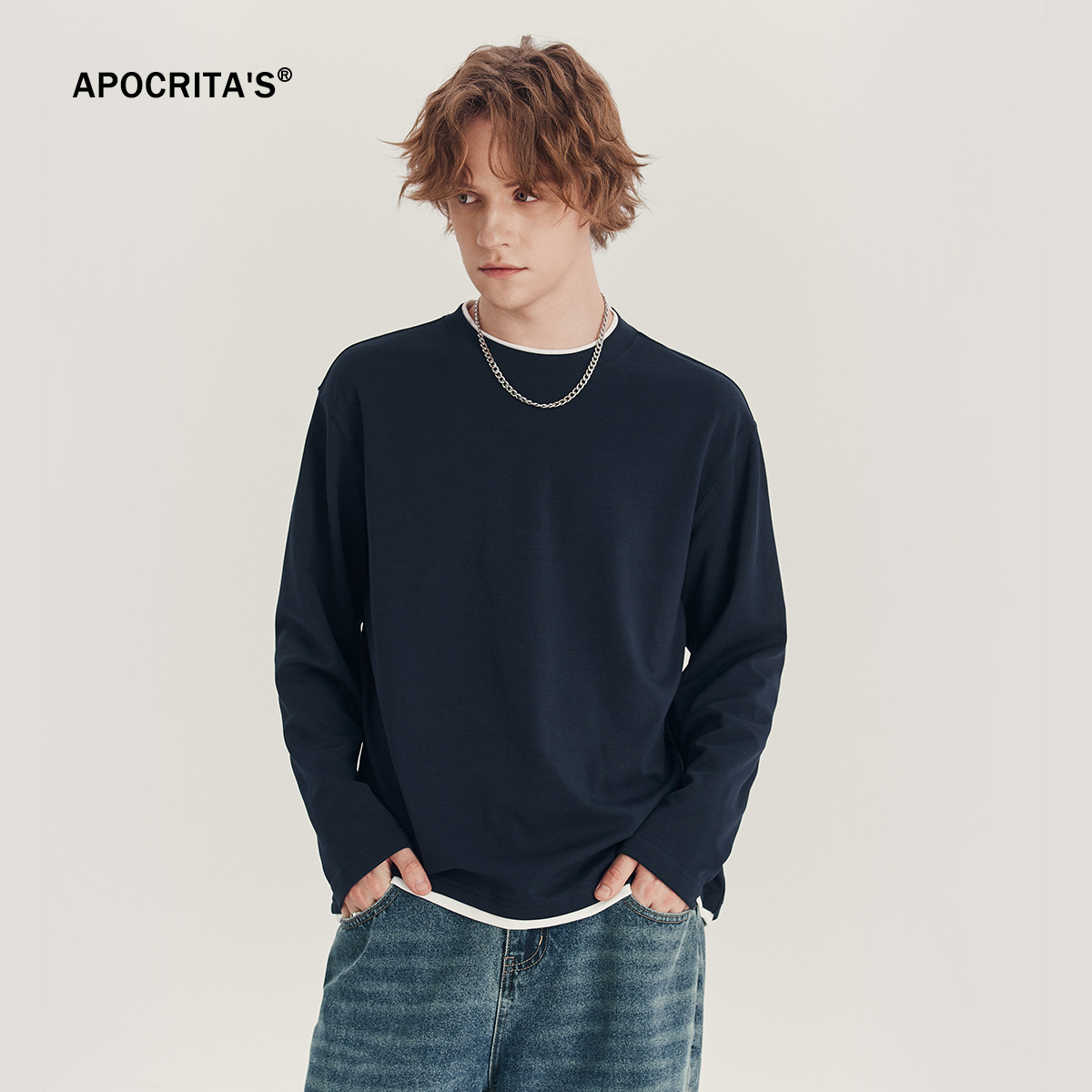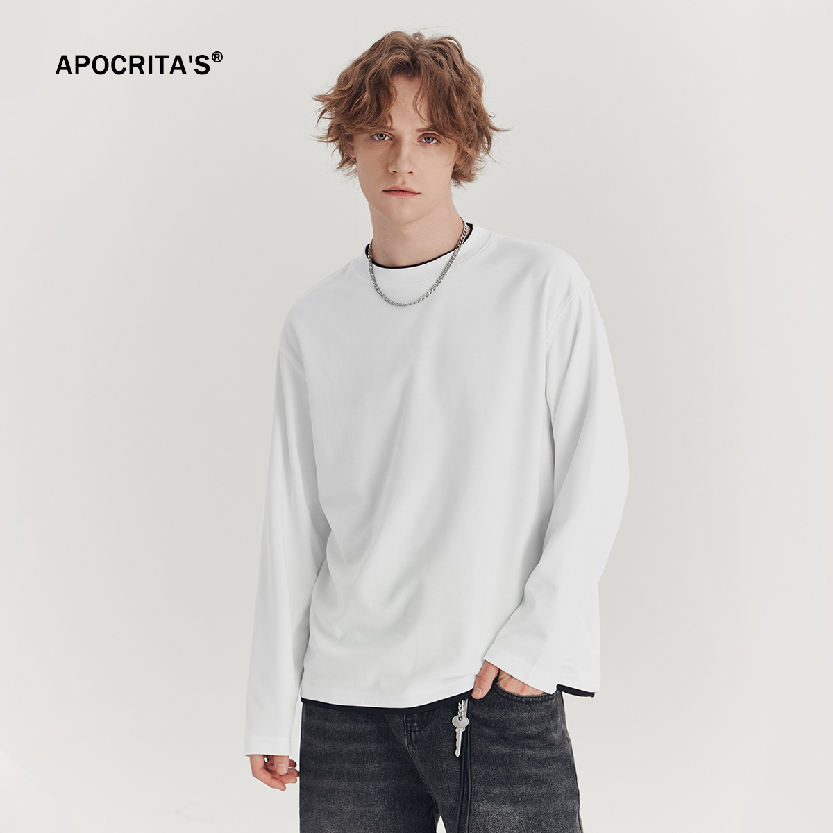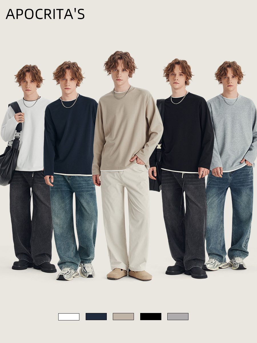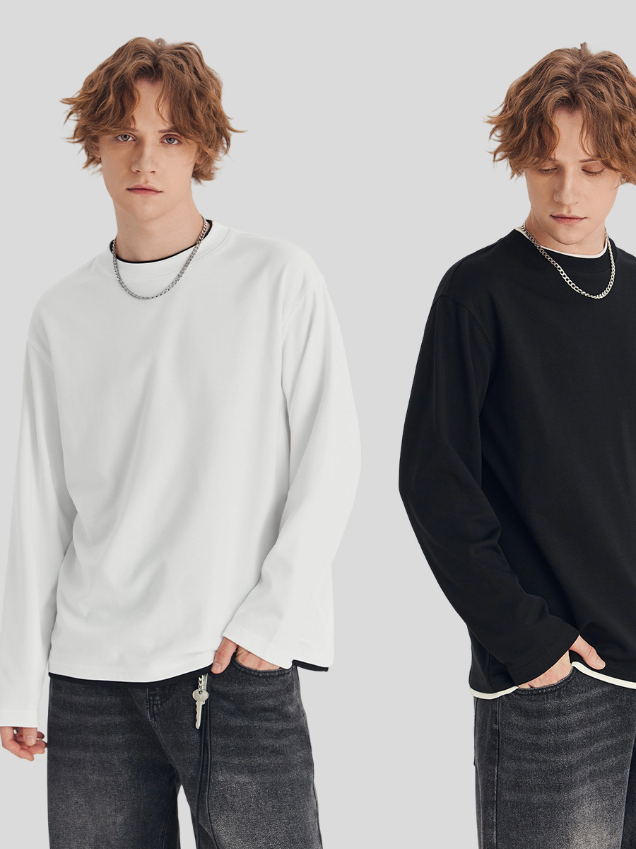 Главная страница > Мужская одежда APO | Мужская футболка с длинным рукавом, имитация двухслойного дизайна, свободный крой, круглый вырез, модный цветовой блок, топ для ношения под одеждой.