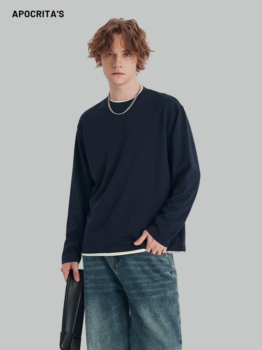 Мужская одежда APO | Мужская футболка с длинным рукавом, имитация двухслойного дизайна, свободный крой, круглый вырез, модный цветовой блок, топ для ношения под одеждой.