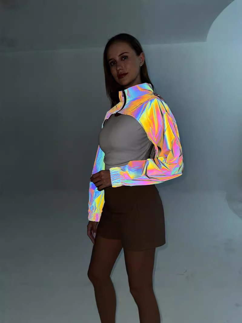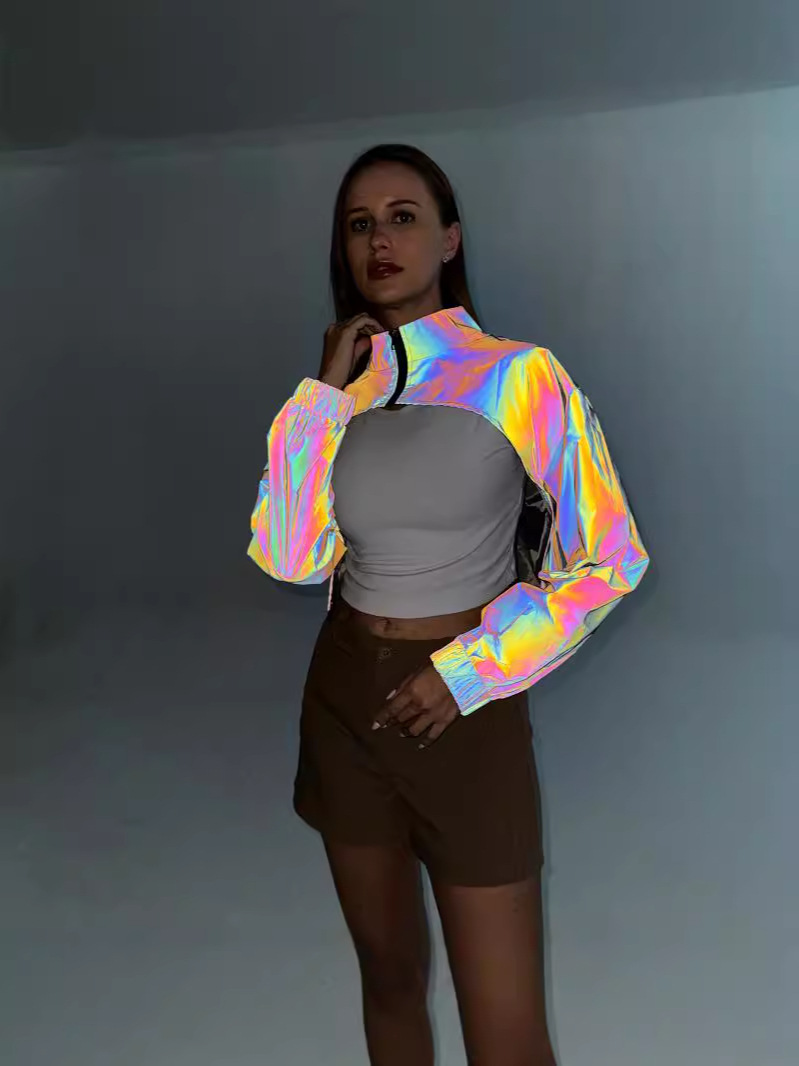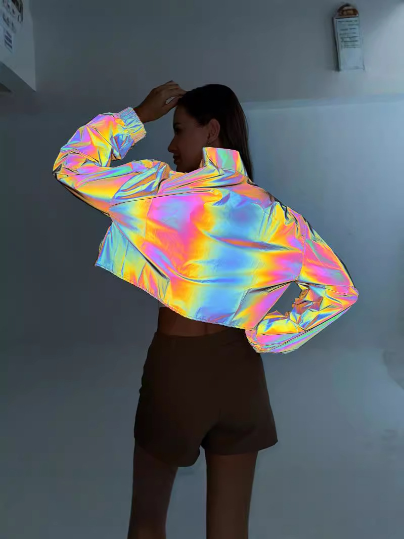 Европейские и американские трансграничные красочные светоотражающие короткие куртки женские европейские и американские иллюзорные светящиеся куртки с высоким талией и воротником