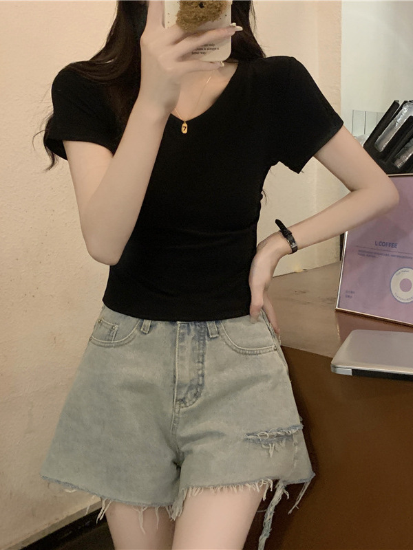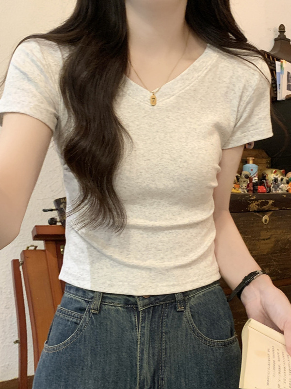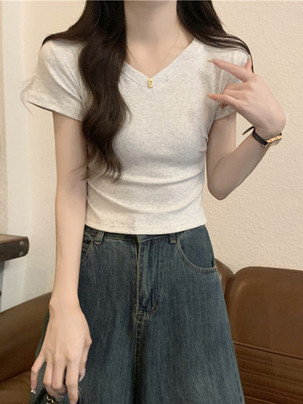 Главная страница > Женская серая футболка с V-образным вырезом, коротким рукавом, летняя, приталенная, укороченная, асимметричная, с завышенной талией, в стиле «сладко-пикантный», сексуальный и независимый стиль.