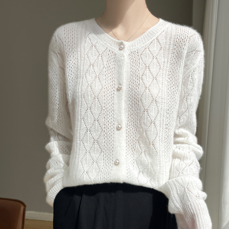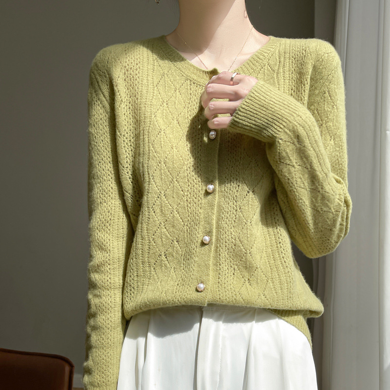 Главная страница > Мягкий и удобный женский кардиган из кашемира с ажурной вязкой и длинными рукавами, свободный однотонный универсальный жаккардовый вязаный жакет из 100% шерсти.