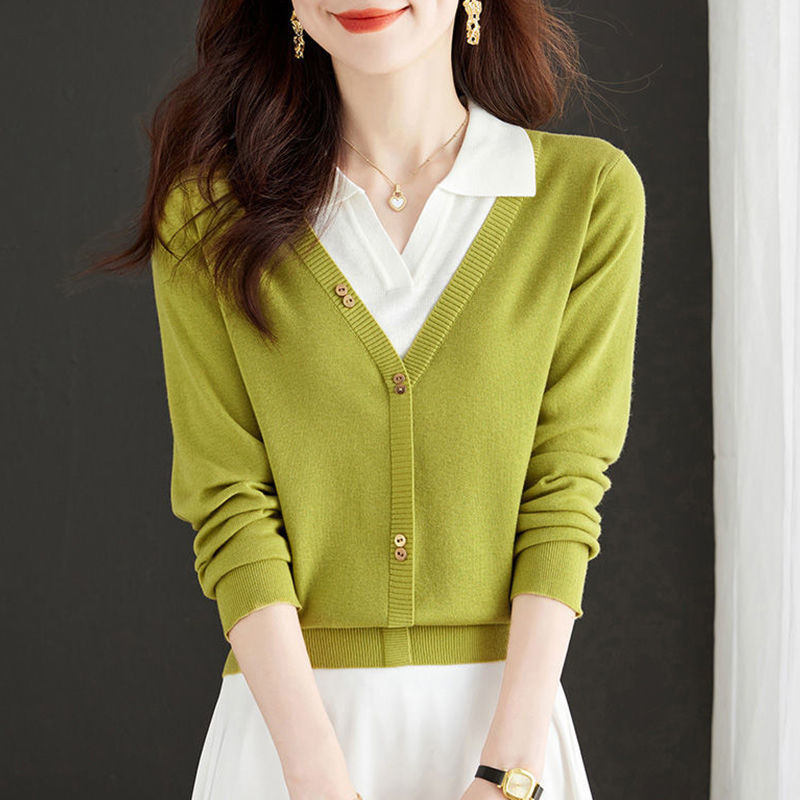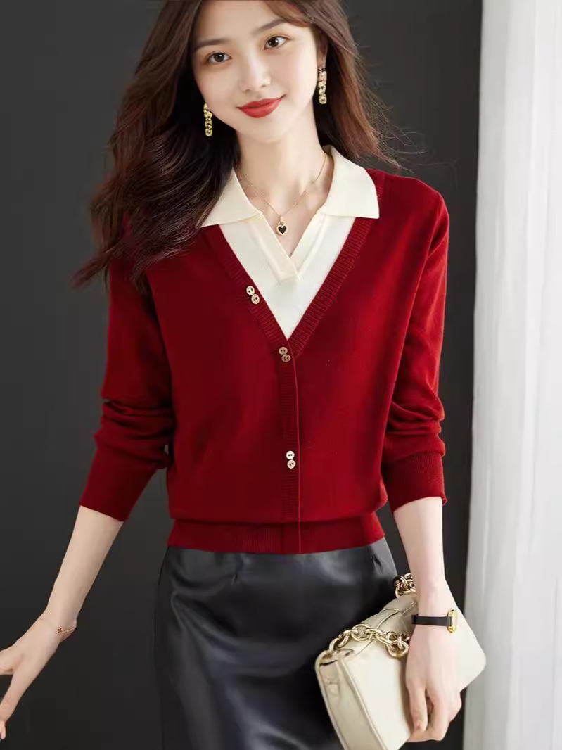 Polo воротник накладные два топа с длинными рукавами мама осень 2024 новый трикотаж женский свитер с лацканом свитер нижняя рубашка