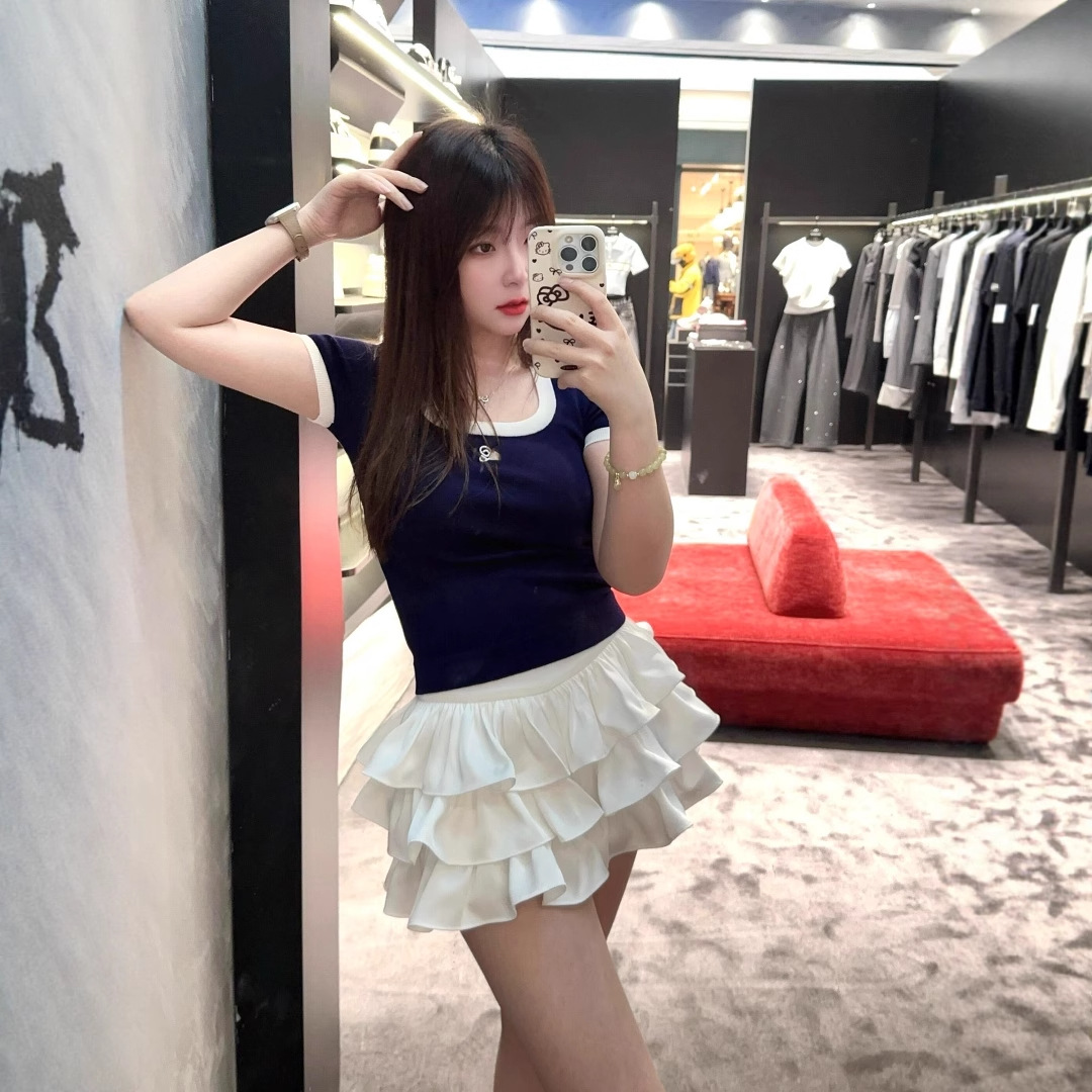 2025 новая летняя вязаная футболка с коротким рукавом, нишевый дизайн, комбинированный, имитация двухслойной, с надписью, женские топы с коротким рукавом