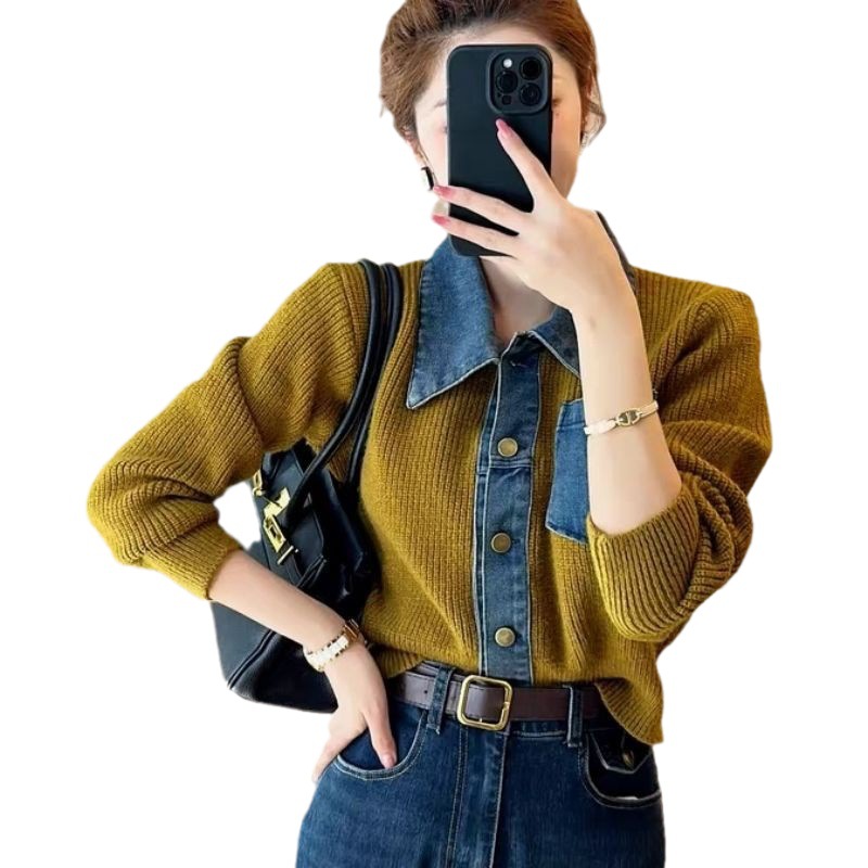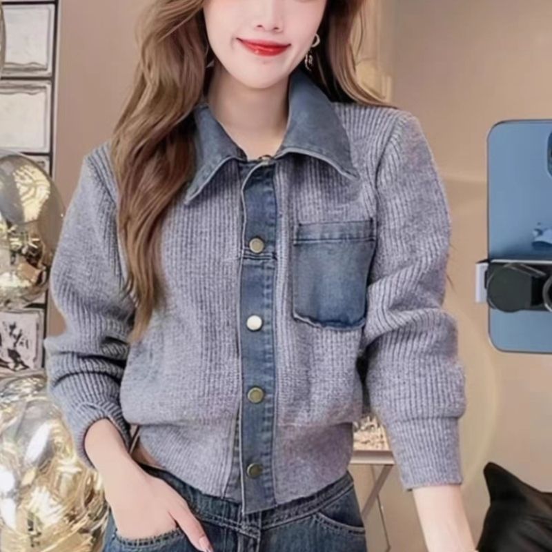 Главная страница > Осенне-зимний женский искусственный короткий топ из двух частей с воротником POLO, женская джинсовая рубашка, вязаный кардиган, свитер, пальто