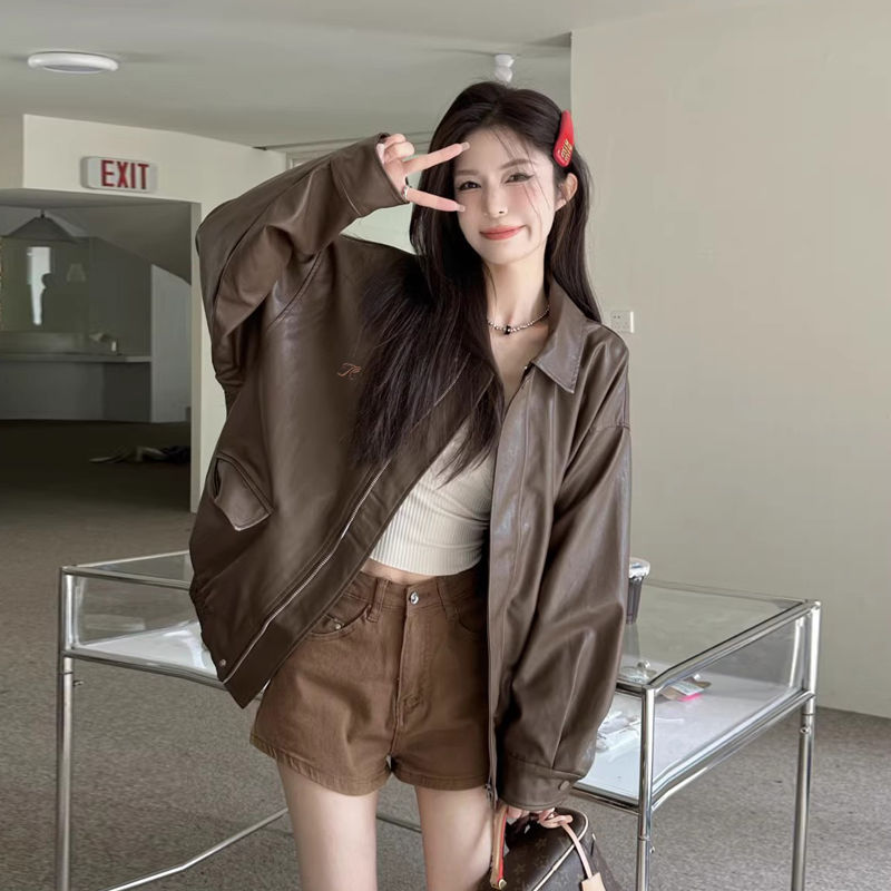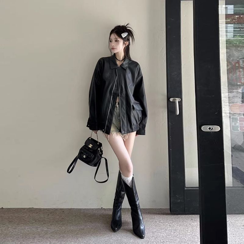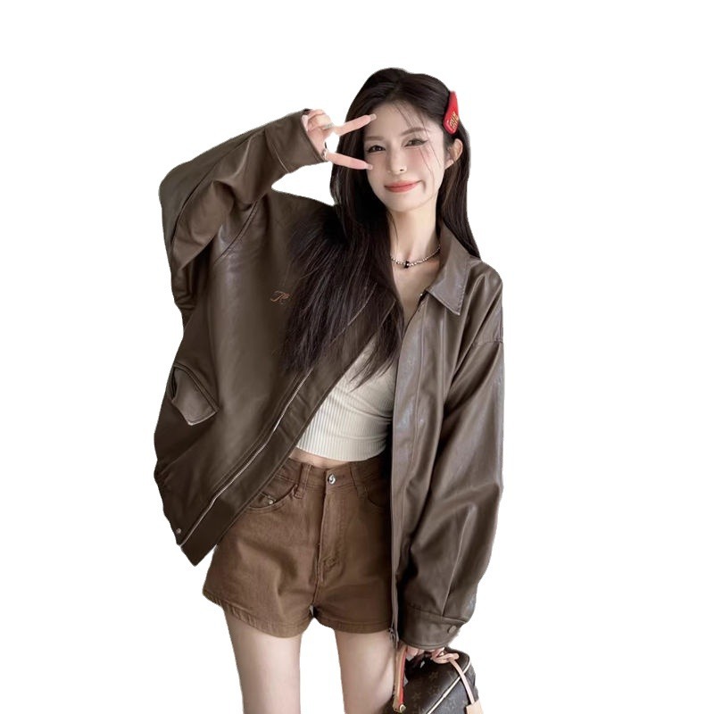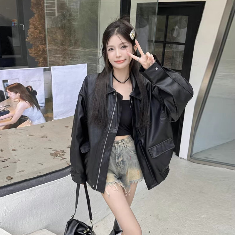 Главная страница > Кожаная куртка Melard для женщин, весна-осень, свободный крой, стройнящая фигуру, в американском стиле, байкерская кожаная куртка, европейская и американская мода.