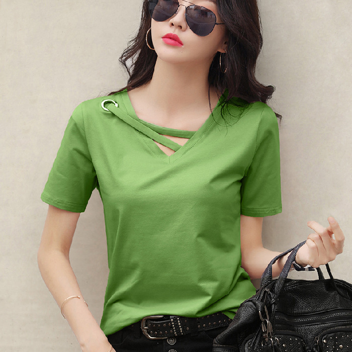 Главная страница > Футболка с V-образным вырезом Женская рубашка с коротким рукавом 2024 летом новый куриный воротник сплошной цвет наполовину рукав короткий t свободный повседневный сплошной цвет нижняя рубашка