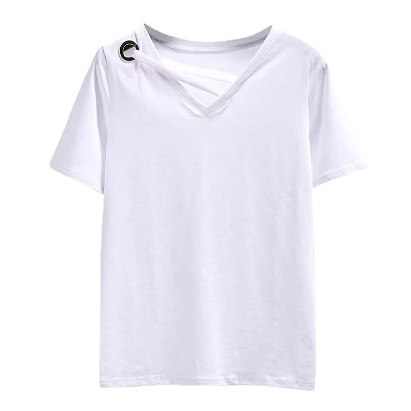 Футболка с V-образным вырезом Женская рубашка с коротким рукавом 2024 летом новый куриный воротник сплошной цвет наполовину рукав короткий t свободный повседневный сплошной цвет нижняя рубашка