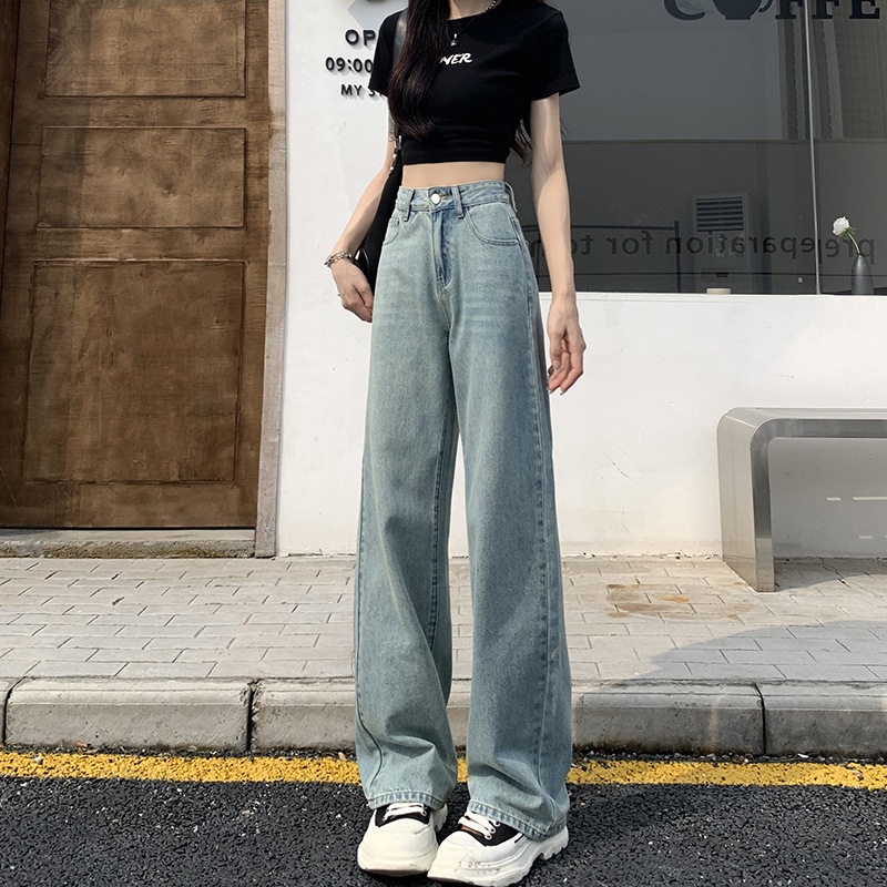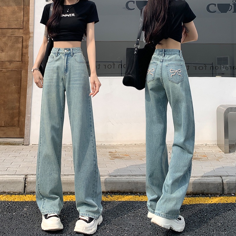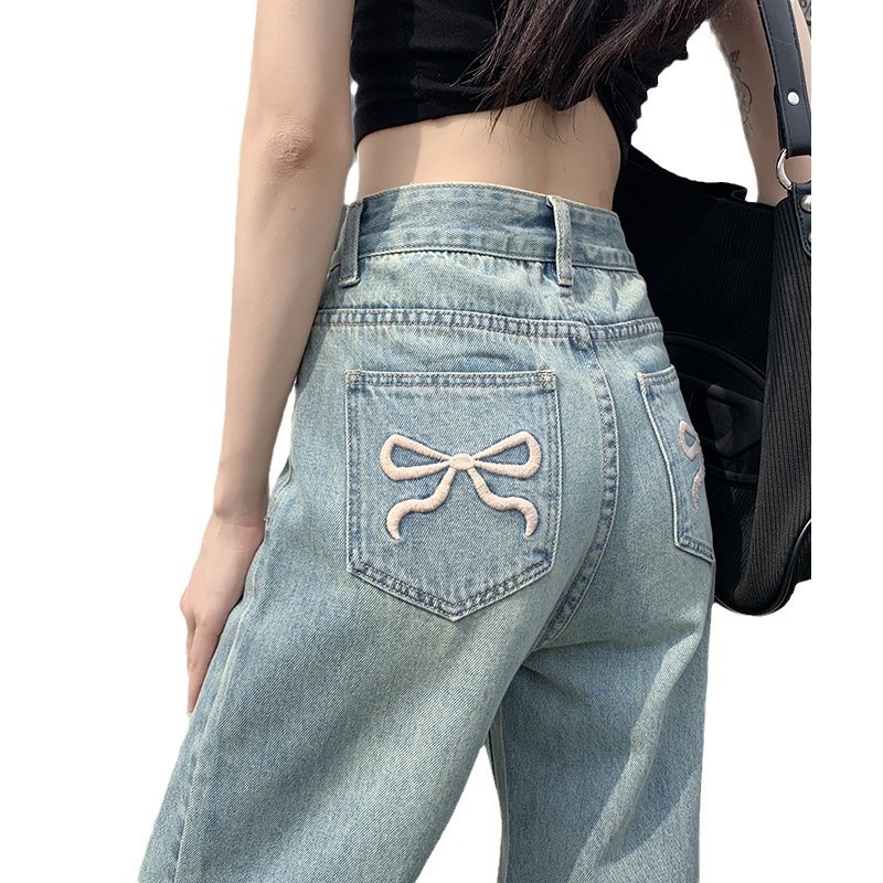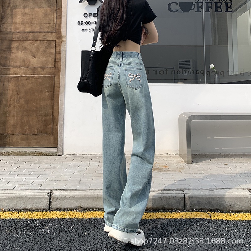 Главная страница > Светло-голубые широкие джинсы с вышивкой бантом для женщин, осень 2024, новые свободные прямые брюки длиной до пола с высокой талией