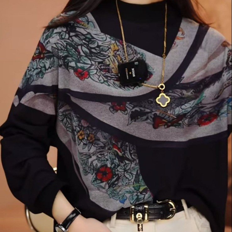 Главная страница > 2024 осень и зима новая женская футболка с длинными рукавами модный темперамент с полувысоким воротником принт шарф рисунок нижней рубашки женский топ