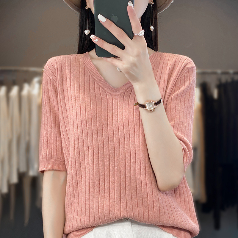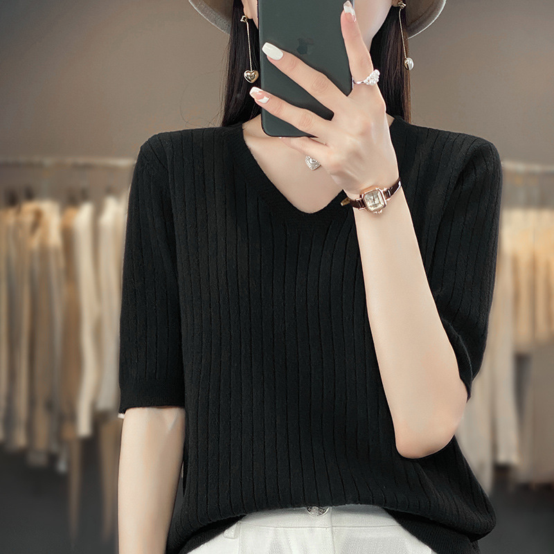 Главная страница > Тонкий V-образный вырез новый внутренний свитер с короткими рукавами женский 2025 весенний свитер вязаный свитер белый тонкий пол-рукава женская футболка
