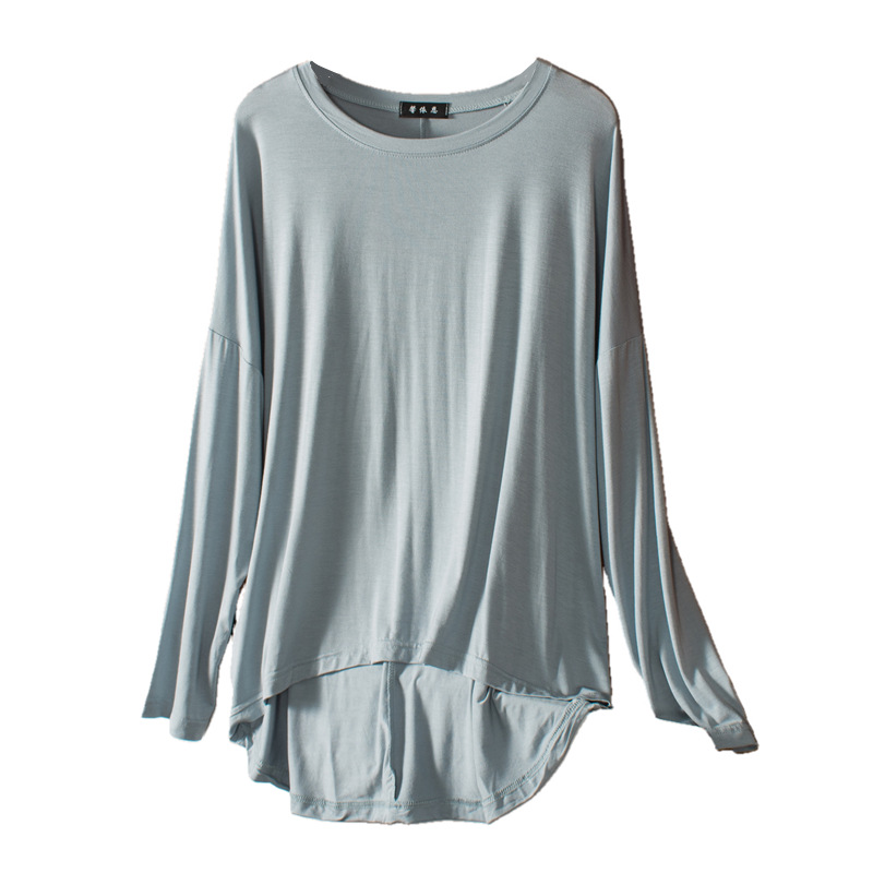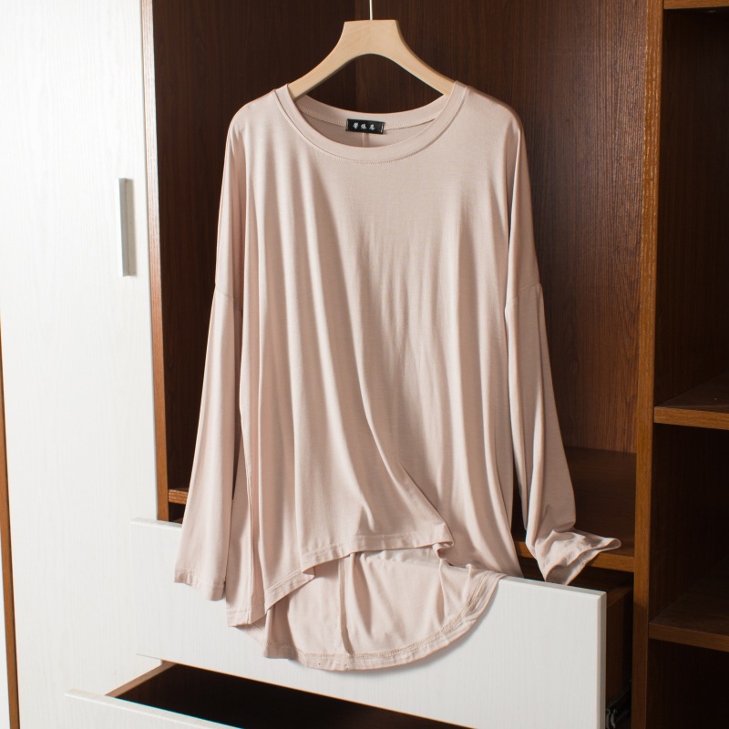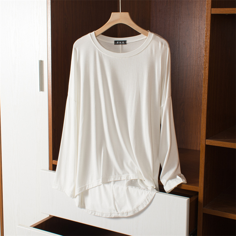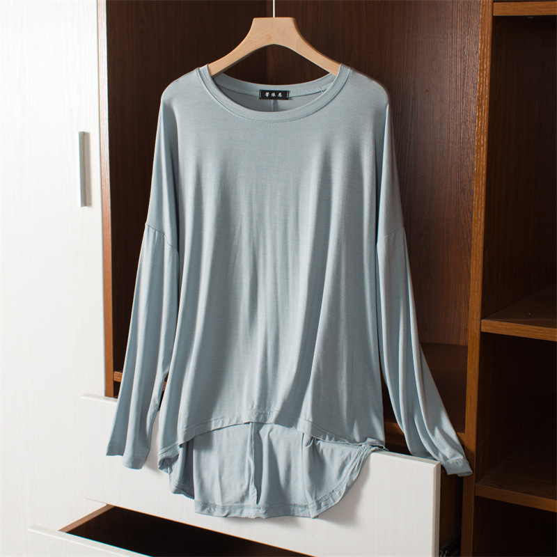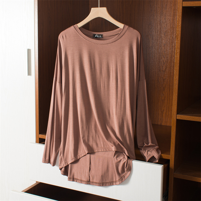 Главная страница > Модальный Свободный Длинный топ спереди с короткой спиной, Женская весенне-осенняя футболка с круглым вырезом и длинным рукавом внутри, однотонная приталенная Базовая рубашка