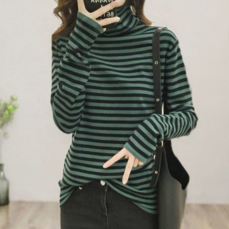 Главная страница > Футболка 2024 дикая эластичная рубашка с высоким воротником нижняя рубашка из хлопка в полоску свободная кожа с длинными рукавами