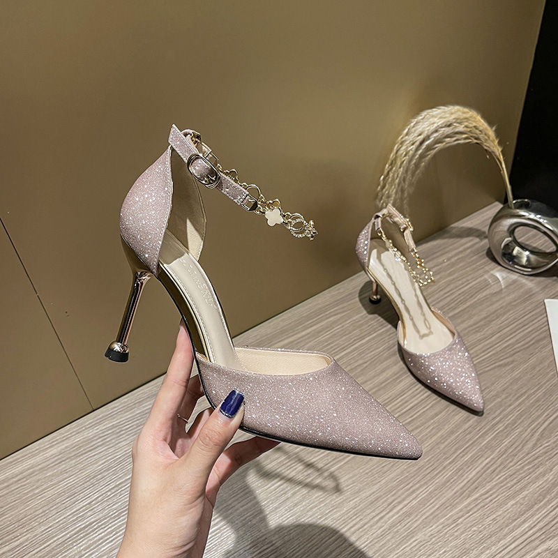 Цепочка с пряжкой One Word Высокие каблуки Босоножки больших размеров на шпильке Блестки Невесты Свадебная обувь для подружек невесты Маленькая обувь для этикета Женская