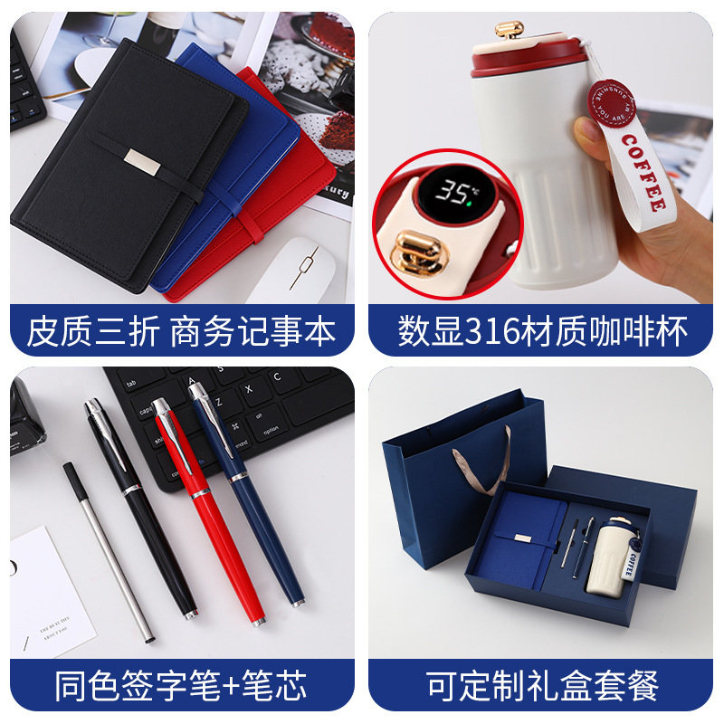Синий [Бизнес-блокнот + термос с цифровым дисплеем на 350 мл + ручка для подписи] Набор